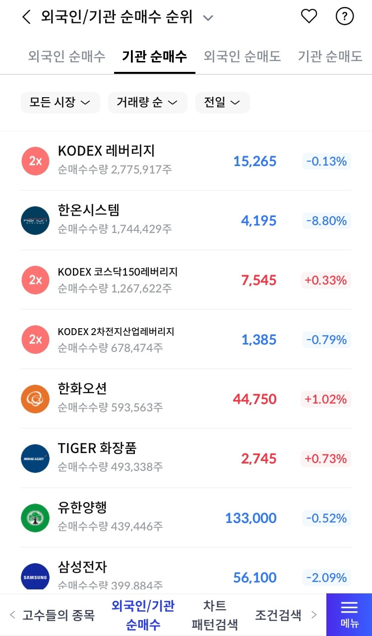 -퀵메뉴 ‘외국인/기관 순매수순위’에서 ‘기관’ 순매수 상위 종목 확인