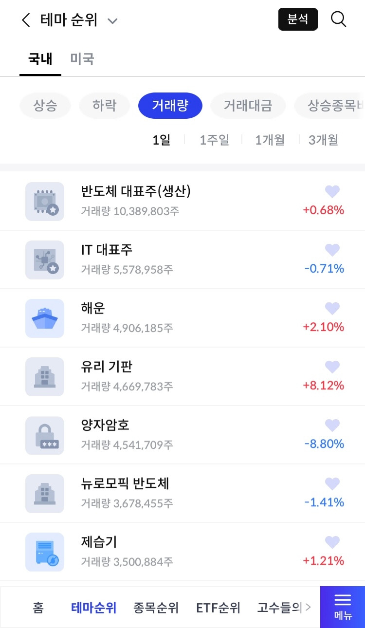 신한투자증권을 기준으로 퀵메뉴 중 ‘테마순위’를 클릭하면 현재 시장에서 주목받는 테마를 직관적으로 파악할 수 있다. 특히 ‘상승률’과 ‘거래량’을 기준으로 종목 및 섹터를 확인해보면 된다. 필터로써 ‘국내’, ‘상승’, ‘거래량’을 적용하여 그 교집합이 되는 섹터를 선별하고, 해당 섹터 내 대장 종목을 선별하는 것이다(한국 증시에서 각광받고 있는 테마를 선별하기 위해 ‘국내’ 필터를 적용하였으나, 미국에 투자하고자 한다면 ‘미국’ 필터를 적용하면 된다). 글로벌 시장 대신 ‘국내’를 선택해 한국 주식 데이터를 기준으로 분석하는 것을 전제로 상승률이 높은 테마를 선택하여 시장에서 현재 상승 모멘텀을 보이는 섹터를 파악한 후, 거래량 기준을 추가해 실제 매매가 활발히 이루어지는 섹터를 파악한다. 상승률이 높은 섹터와 거래량이 많은 섹터의 교집합 테마를 추출하는 것이다. 상승률이 높으면서 거래량이 지속적으로 증가하는 섹터는 무엇인가? 가령 유리기판 섹터가 상승률 +8.12%인데, 거래량 상위에 포함된 섹터라고 해보자. 이를 ‘상승률’과 ‘거래량’의 교집합 섹터로 선별하는 것이다.