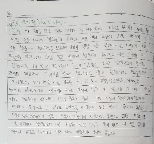 이 책을 읽고 범수 아빠가 일하는 곳에서 다치고 난 뒤 쉬는 날이면 술을 마시고 범수에게 폭력과 욕을 해서 화났다. 그리고 범수가 방 창문으로 편의점을 보는데 거기서 맨날 오는 찬혁이라는 아이가 다른 사람이 먹다 남긴 음식도 먹고 편의점 형한테 혼나기도 하는 모습을 보니 찬혁이가 왜 맨날 편의점에 오는지 궁금했다. 또한 담배꽁초가 들어간 라면을 먹으려던 찬혁이를 범수가 도와주기도 했고 찬혁이가 범수한테 자기 자신이 거의 맨날 하는 큐브를 주는 걸 보니 행복해 보였다. 어느 날은 범수가 아빠한테 소주잔에 맞아 병원에 입원하게 됐는데 그때도 찬혁이가 병문안을 온다고 하고 새로운 큐브도 줘서 그나마 마음이 편안해지겠지만 아빠의 폭력으로 큰 상처가 남아있을 것 같다. 이젠 범수가 폭력과 욕설로 상처받지 않았으면 좋겠고 화목한 가정에서 지냈으면 좋겠다. 또한 찬혁이도 밤늦게까지 편의점에서 다른 사람들이 남긴 음식을 먹지 말고 더 좋은 음식을 먹으면 좋겠고, 할머니도 빨리 나아 행복하게 지내면 좋겠다.