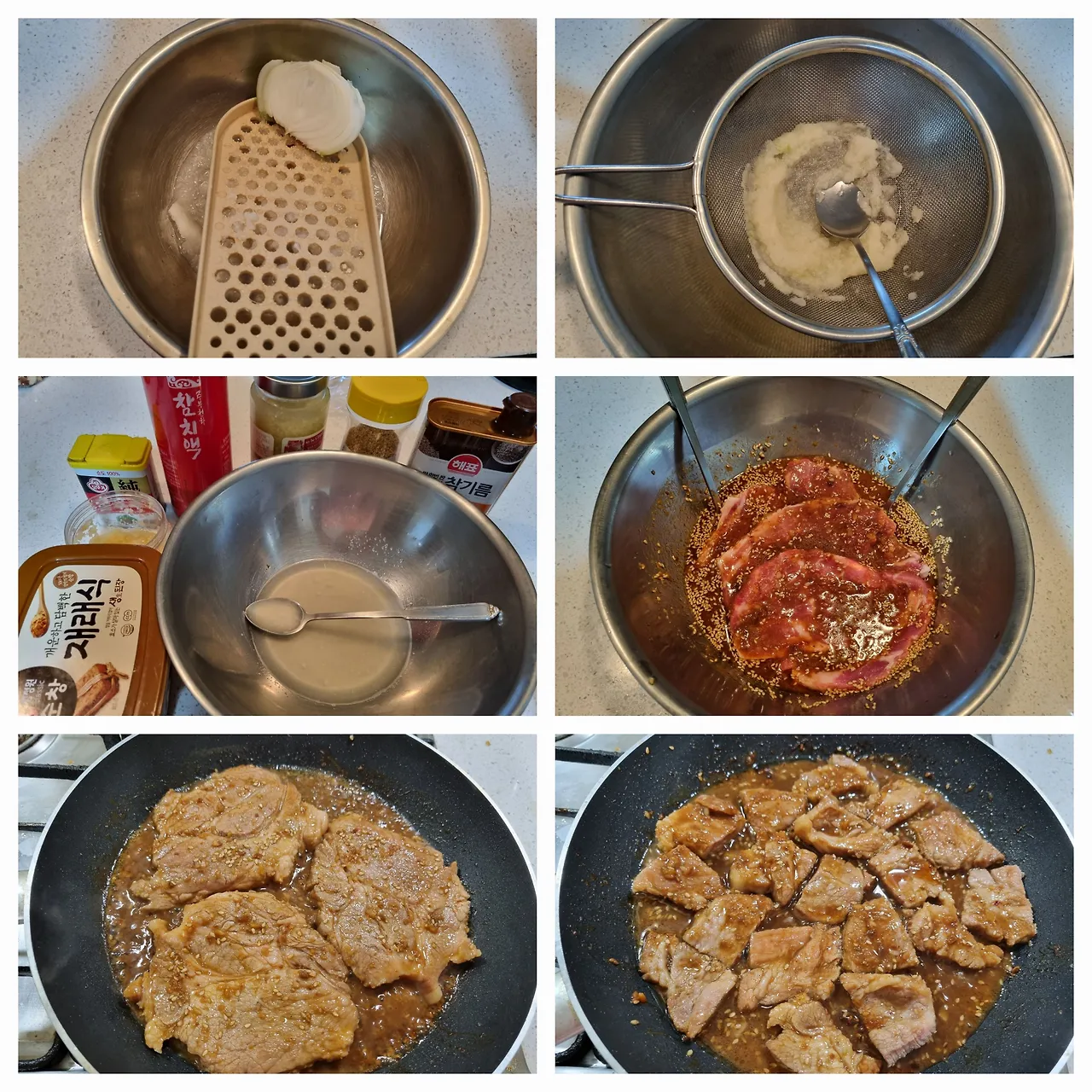 -프라이팬에 기름을 두르고 양념국물은 빼고 고기만건져 중불 이하로 타지 않게 천천히 구워라.