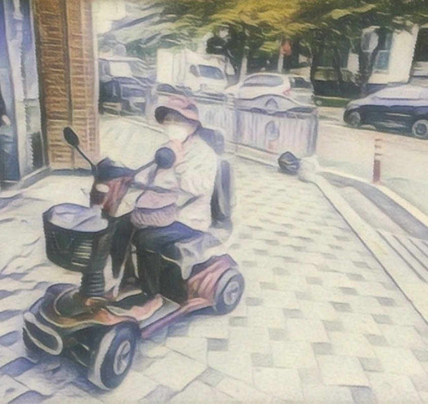 다시 한동안 안보이시더니 어느 날, 짜잔! 전동 휠체어를 타고 나타나셨다. 능숙하게 속도와 방향을 조작하시며 동네는 물론 큰길의 횡단보도를 건너 어디엔가 다녀오시고 무엇이라도 사서 작은 봉지를 싣고 시원하게 달리신다. 추운 날에도 옷을 든든하게 입으시고 능숙하게 기기를 조작하시며 씩씩하게 달리신다. (좋고 따뜻한 옷을 제대로 갖춰 입으시는 걸 보면 돌보는 분이 없는 것 같지는 않다.) 이제는 며칠 안 보이면 궁금하고 걱정이 될 정도이다. 부디 건강하셔서 전동 휠체어로 쌩쌩 달리시는 모습을 오랫동안 보여주셨으면 좋겠다.
