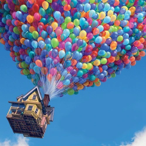 바깥세상은 칼의 집을 제외한 주변이 재개발을 하느라 포클레인과 트럭들이 왔다 갔다 하며 정신이 없다. 그러나 아무리 집을 팔라고 권유해도 그는 그가 죽고 나서 하라며 요지부동이다. 그들과 씨름하다가 일어난 다툼으로 그는 법정에서 양로원에 들어갈 것을 명령받는다. 그는 생각 끝에 엘리와의 약속대로 그녀와 함께 파라다이스 폭포에 가기로 결심하고 자신이 가진 모든 풍선에 헬륨가스를 넣어 집에 연결하고 집을 비행선으로 만들어 먼 길을 떠난다. 이때 마침 문밖에 있던 꼬마 러셀도 함께 가게 된다. 러셀은 어릴 때 엄마가 떠나고 아빠는 재혼하여 가끔씩만 아들을 만나는데, 그는 자신과 아이스크림을 먹으며 빨간 자동차 수를 세던 아빠를 그리워하는 외로운 소년이다.