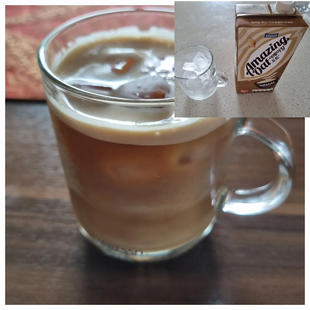 다음은 아이스 라테인데, 이것도 나같이 우유를 먹으면 배 아픈 사람에게는 그림의 떡이다. 물론 스타벅스에서는 저지방우유나 무지방우유를 선택할수 있지만 일반 카페에서는 우유선택의 폭이 넓지 않다. 그래서 여기서는 블루 보틀의 메뉴를 따라 해 보았다. 1샷은 디카페인으로, 1샷은 카페인 들은 걸로 반반씩 넣고 우유 대신 오트 우유를 넣고 얼음을 넣는다. 그러면 얼추 라테 맛이 나고 곡물 덕분에 든든하기까지 하다. 두 샷 다 디카페인으로 넣어도 좋다.