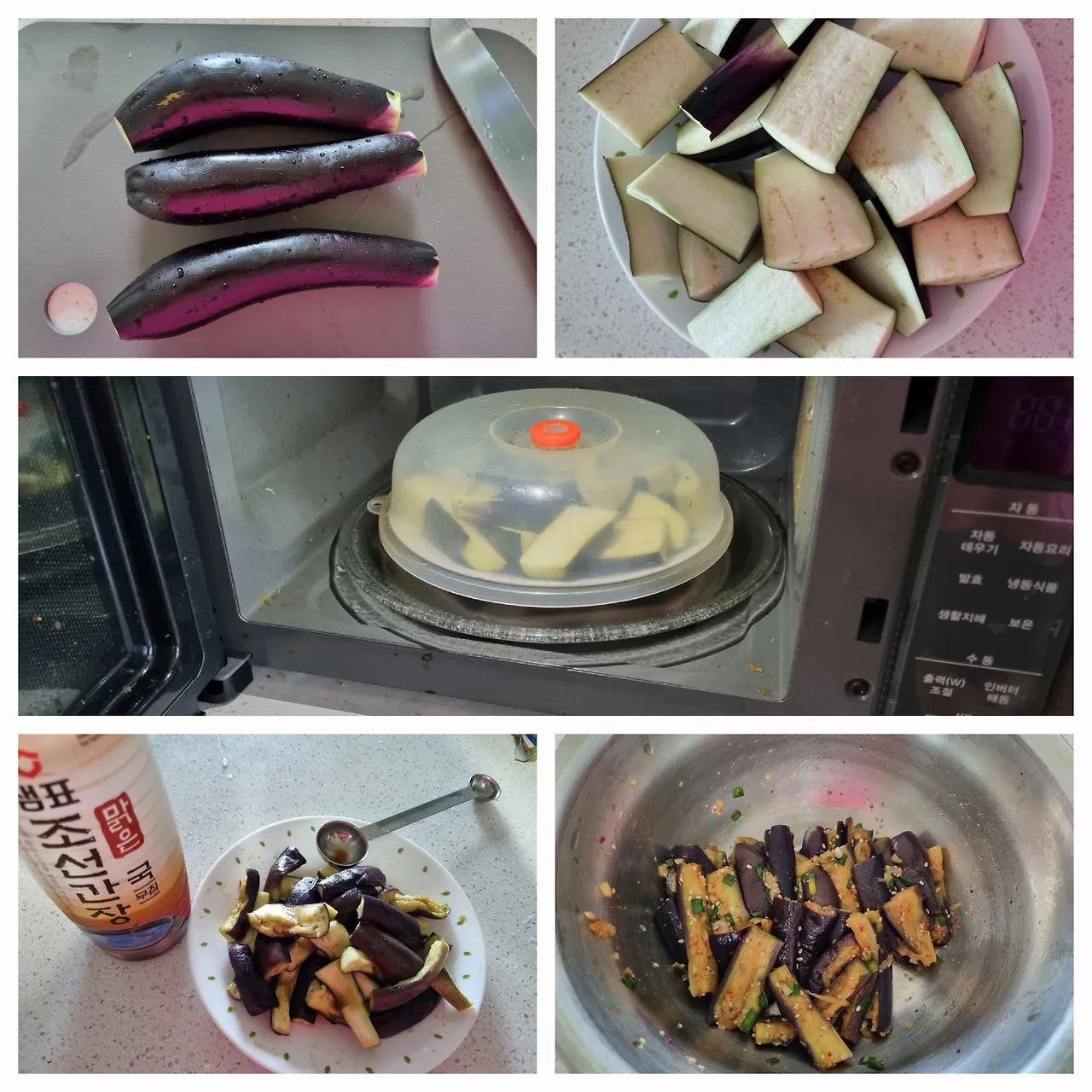 -가지 3개를 3 등분하고 길게 반으로 가른 뒤 전자레인지에 뚜껑을 덮고 3분간 가열한다.