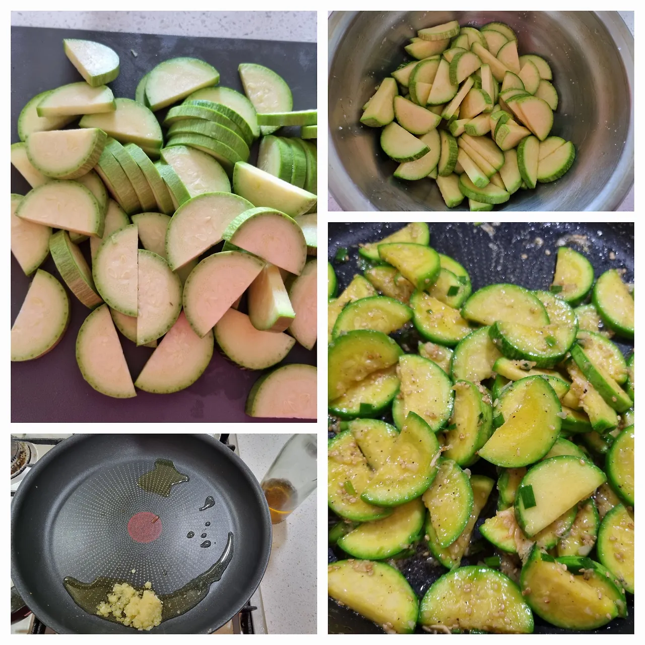 -팬에 들기름을 넣고 다진 마늘을 먼저 넣고 향을 낸 후 호박을 넣고 볶다가 새우젓 반 큰 술을 넣고 중불에 볶는다.