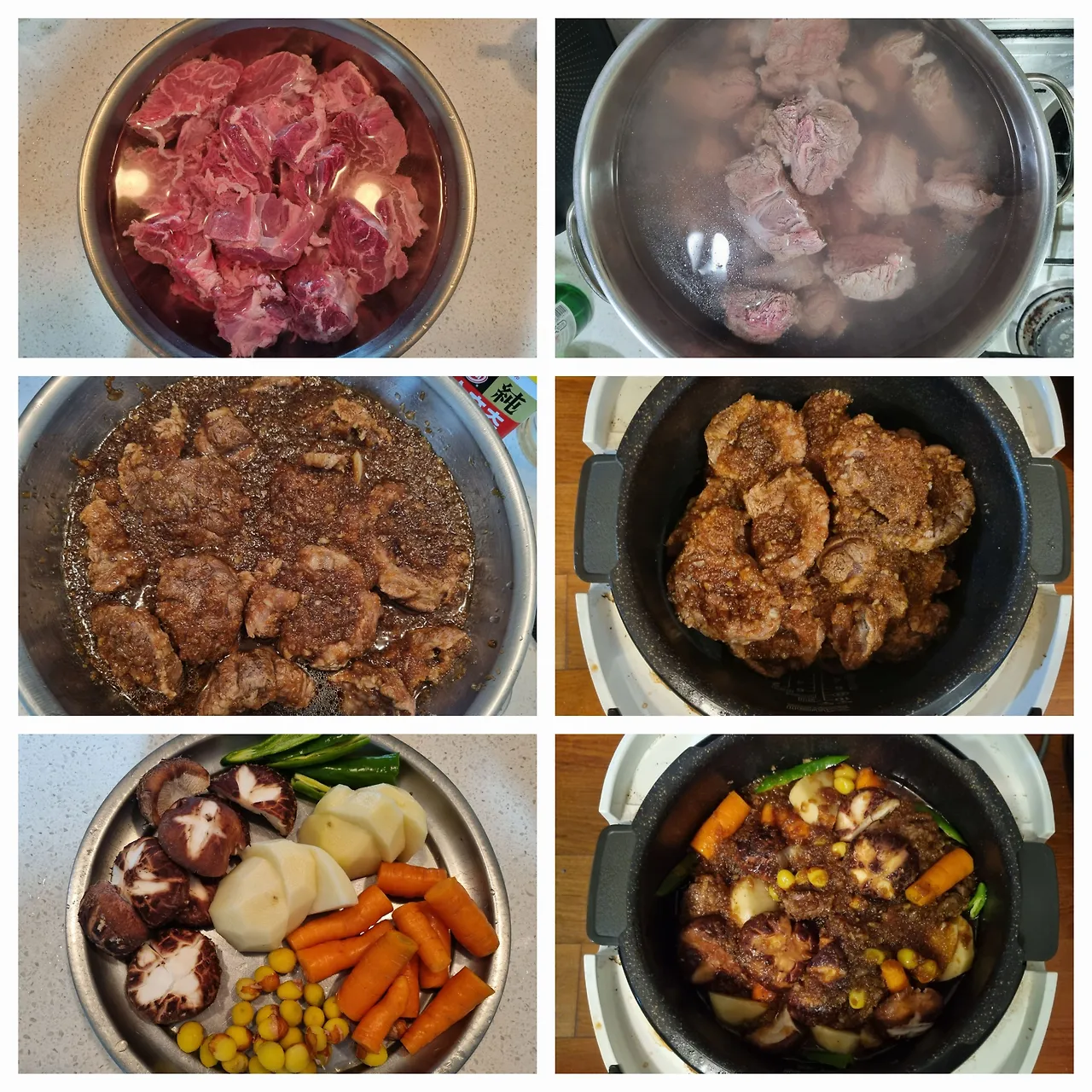 -사태 2kg을 큼지막하게 덩어리로 자른 뒤 물에 담가 1시간 정도 핏물을 뺀다.(6인용 전기 밥솥이라면 1kg으로 줄여서 한다.)