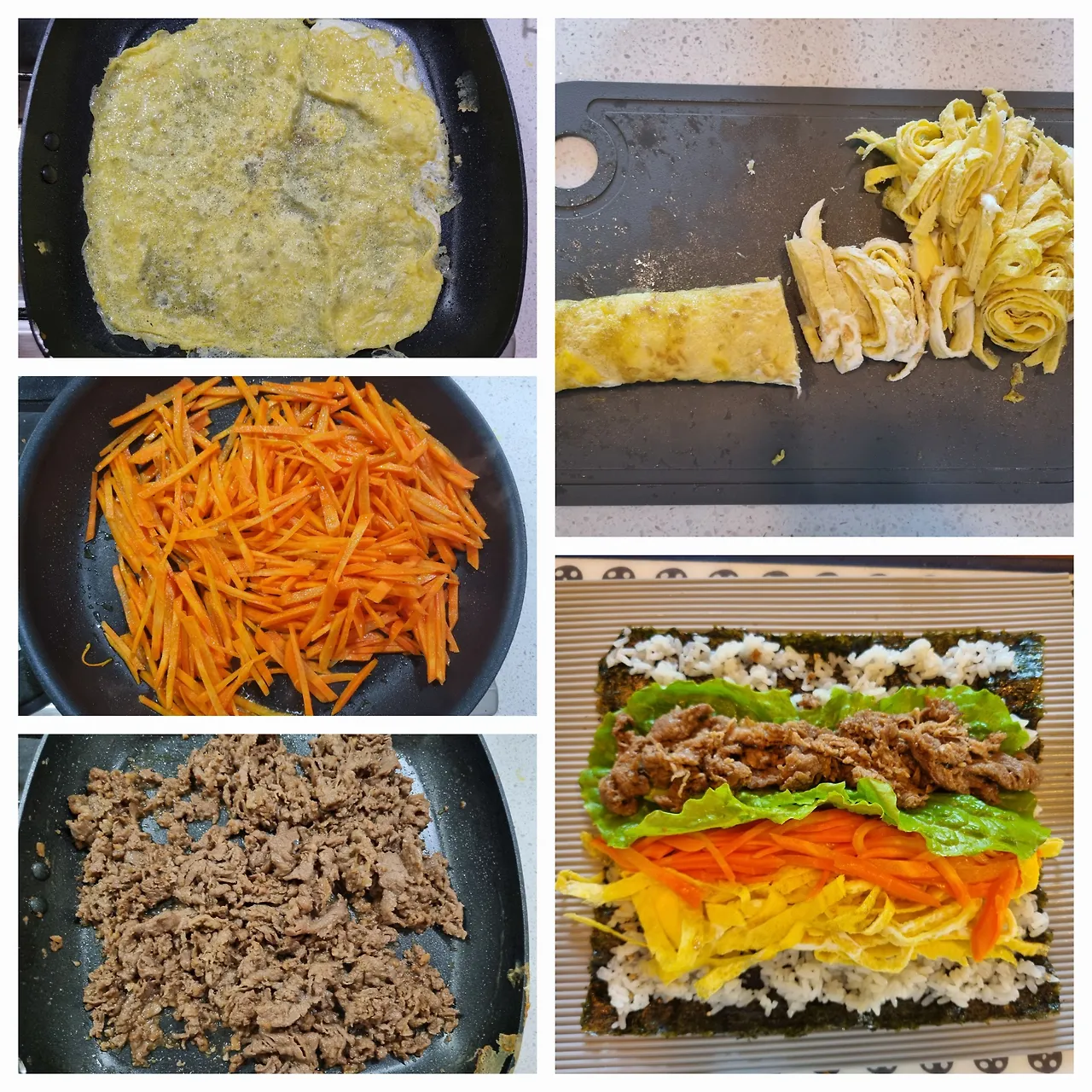 -당근채, 계란채를 듬뿍 넣고 밥 위에 상추를 두 장 놓고 불고기를 그 위에 올린다.