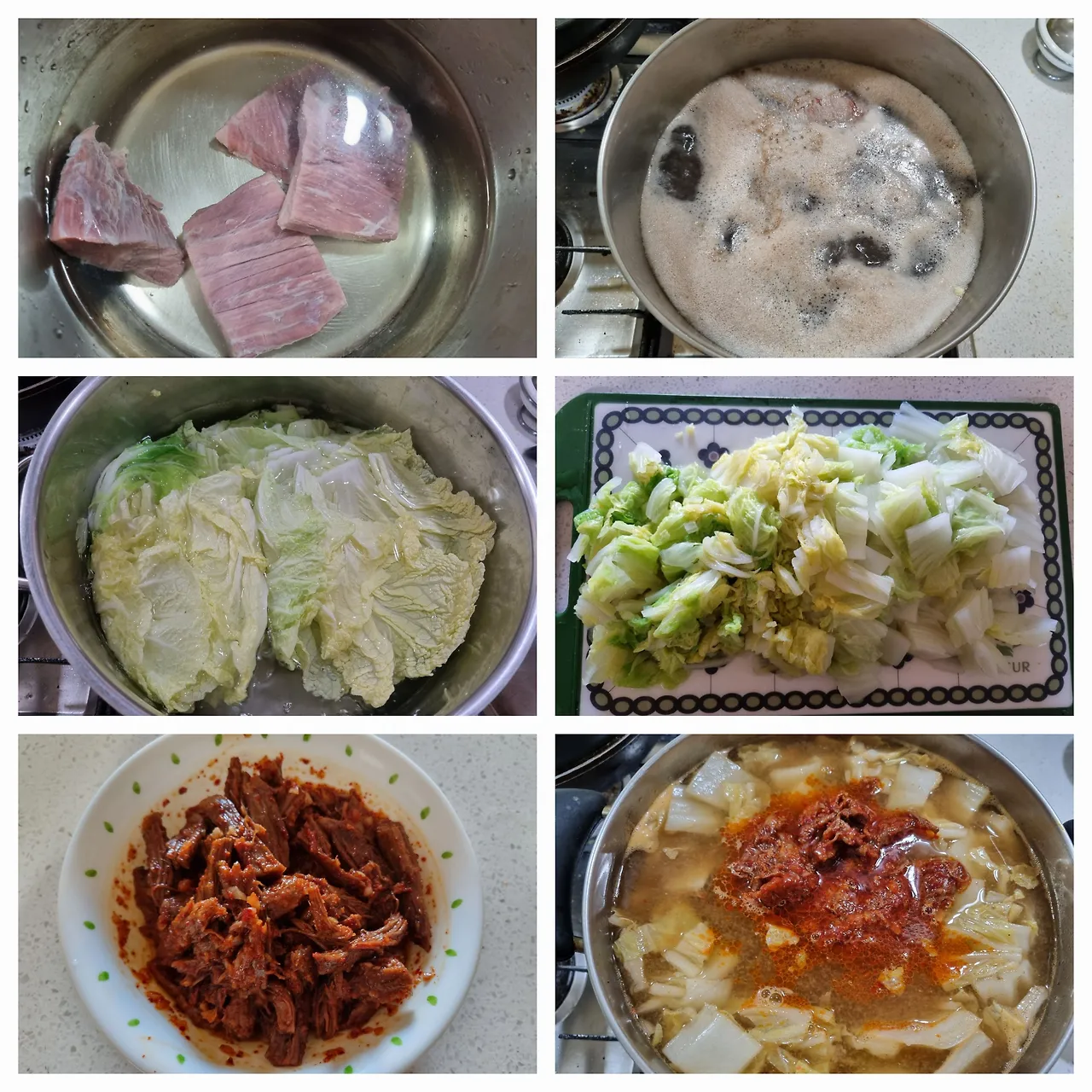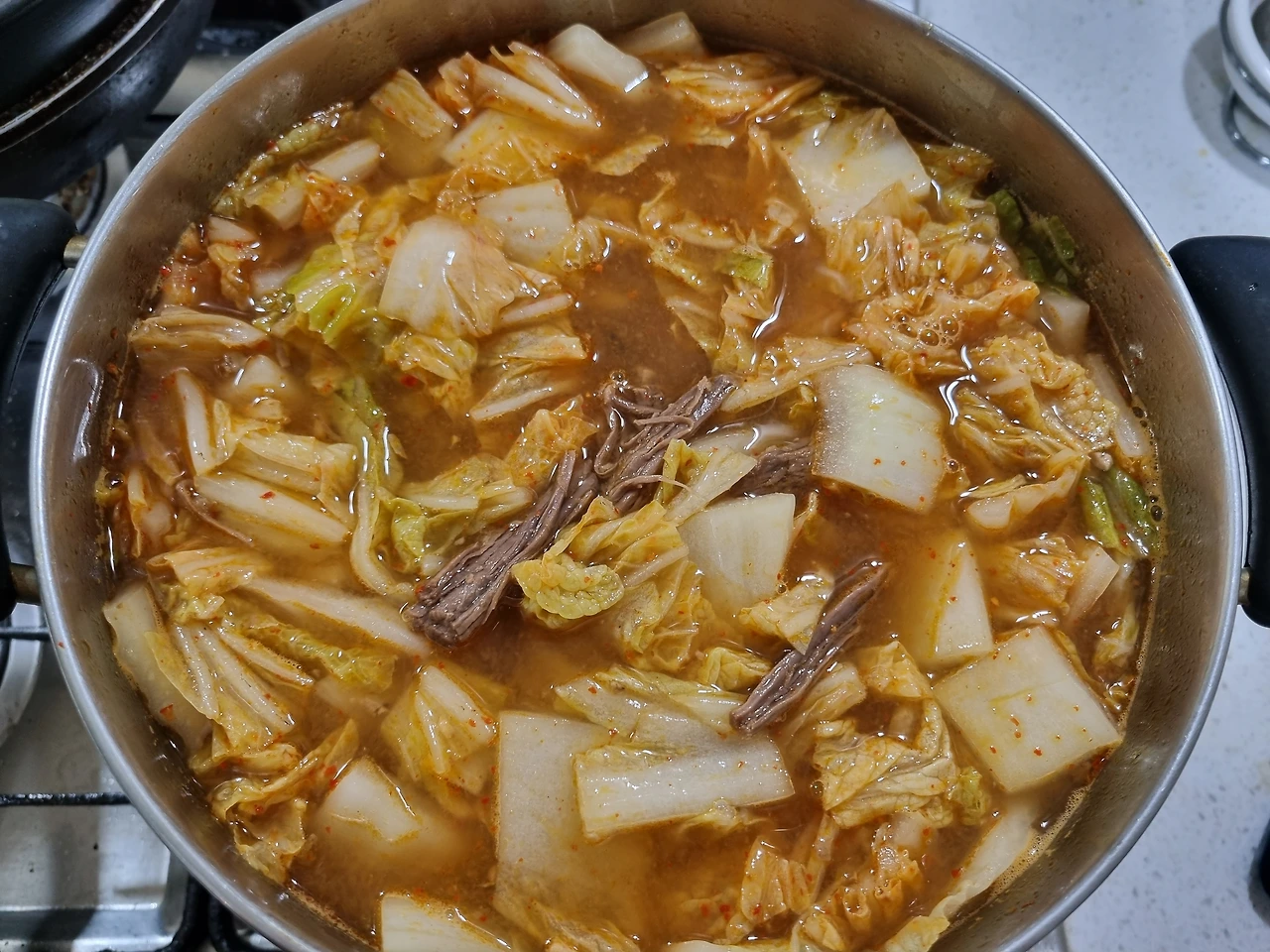 -된장물이 끓으면 데친 배추와 양념된 고기를 넣고 처음엔 강불, 끓으면 약불로 줄이고 20분쯤 더 끓인다.