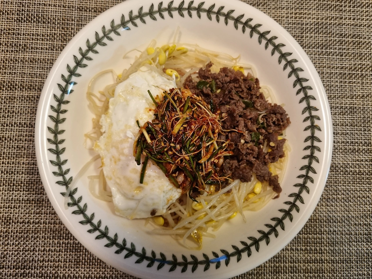 -그릇에 밥을 깔고 위에 콩나물을 듬뿍 얹은 후 소고기 볶음, 계란 프라이. 달래 간장을 올리고 비벼 먹는다.