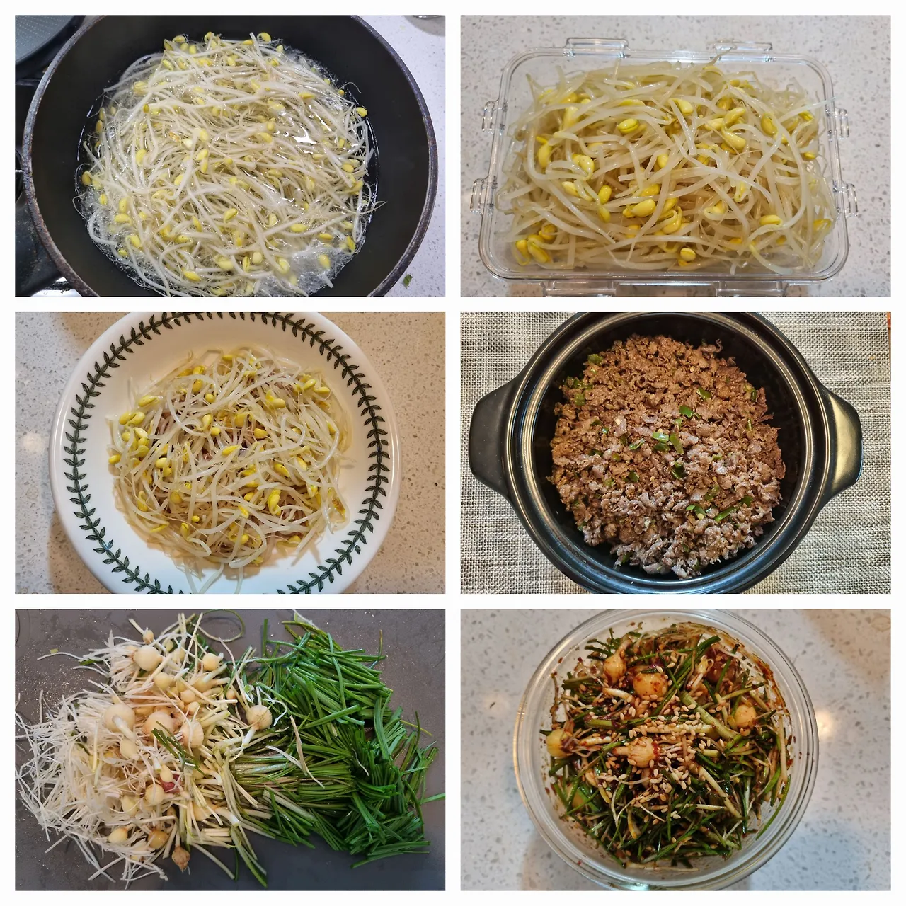 -물을 끓여서 콩나물을 넣고 데친 후 찬물에 헹구어 밭쳐놓는다.