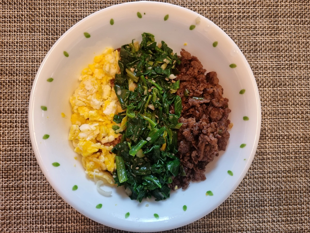 -위에 스크램블드 에그와 볶은 소고기와 초록색 채소 다진 것(쪽파, 부추, 시금치나물, 데친 브로콜리, 절인 오이 중 하나)을 예쁘게 올린다.