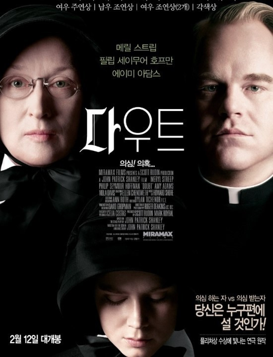 확신에 찬 알로이시스 수녀가 도널드 엄마와 면담을 마치고 들어올 때 카메라가 높은 곳에서 그녀를 비추는 장면과 건물 안에 들어왔을 때 그녀가 있는 복도를 비스듬한 각도로 비추는 것으로, 그녀의 의견이 신과는 다를 수도 있다는 것과 그녀가 편견을 가질 수도 있다는 것을 보여준다.