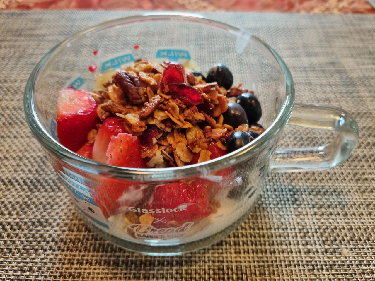 -위에 플레인 요거트(또는 그릭 요거트)를 한층 올린다.(양은 취향껏 하는데 작은 용기 요거트 하나 정도면 좋다.)
