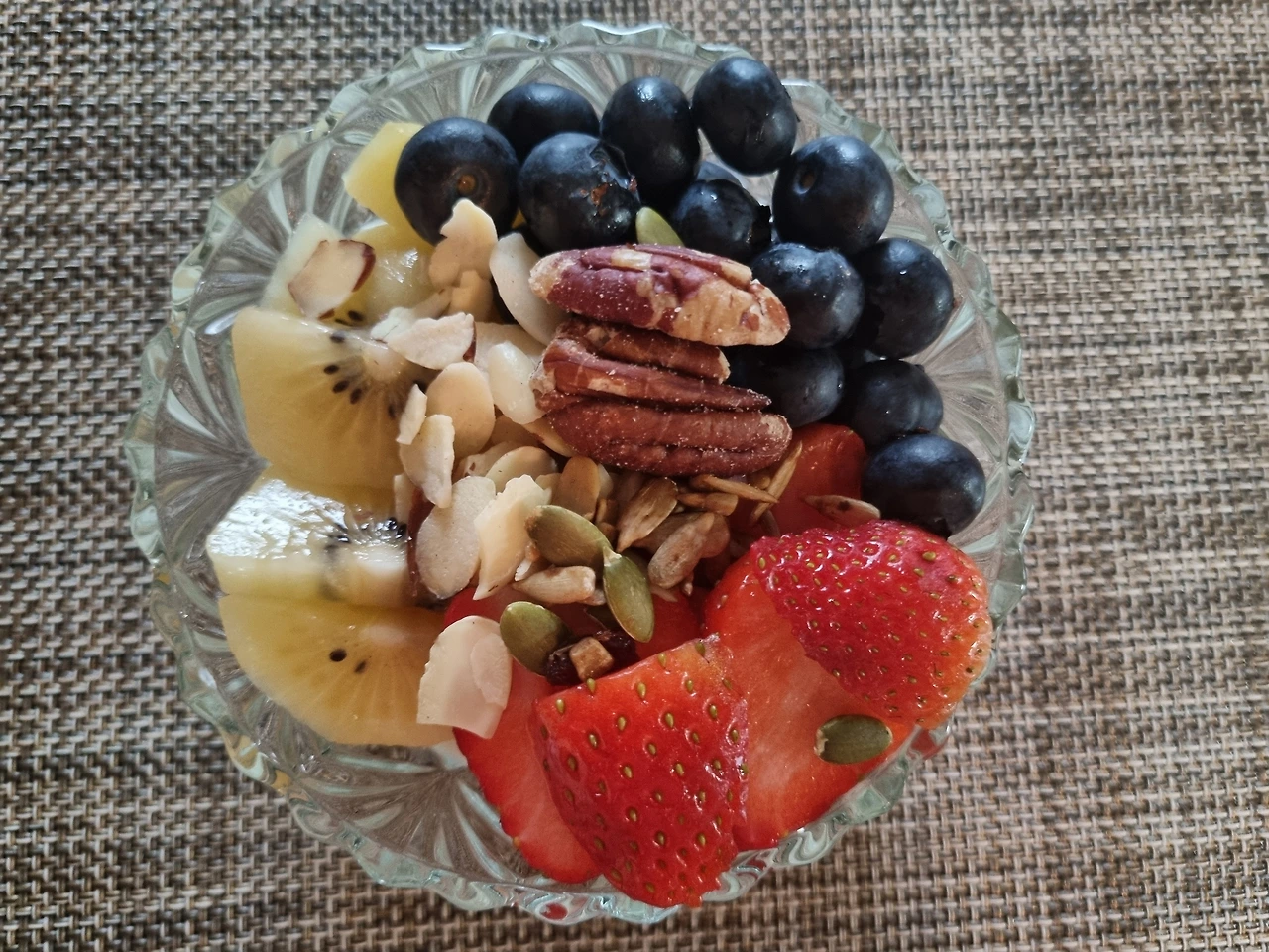 -그 위에 좋아하는 과일(조직이 부드러운 딸기, 바나나, 키위, 블루베리 등)을 슬라이스 하거나 깍둑썰기해서 빙 두른다.