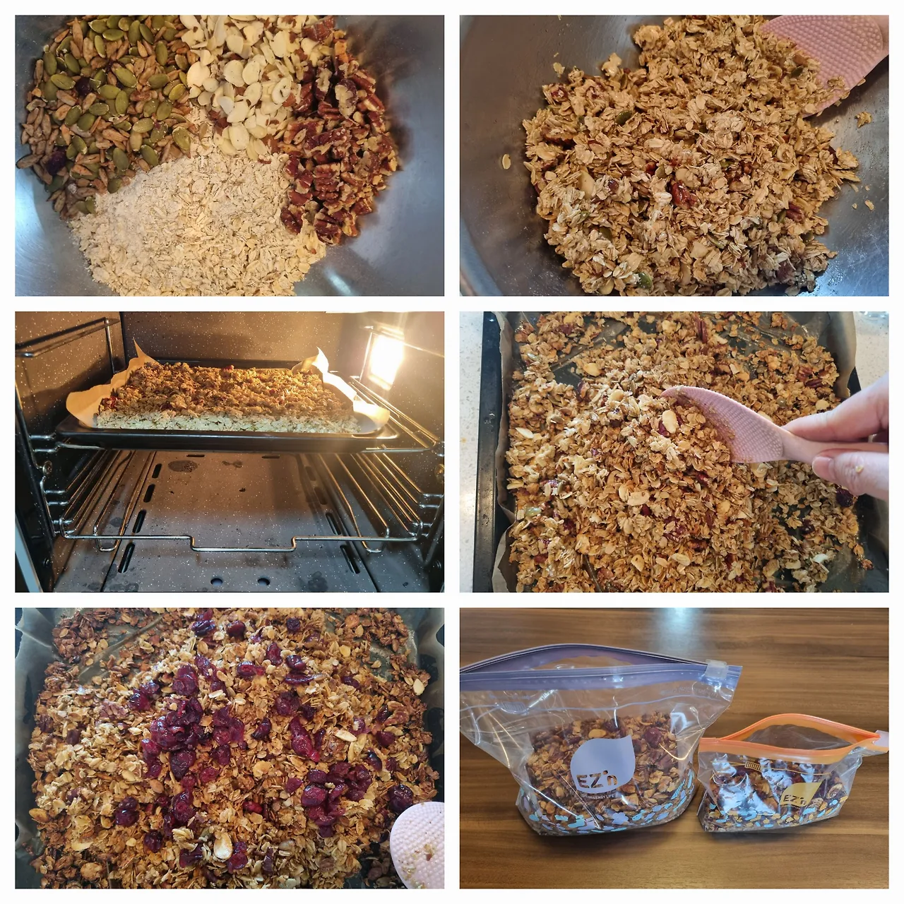 -큰 보울에 오트밀 300g( 3컵) 슬라이스 아몬드 반 컵, 해바라기 씨 반 컵, 호두나 피칸 굵게 다진 것 반 컵을 넣고 잘 섞는다.