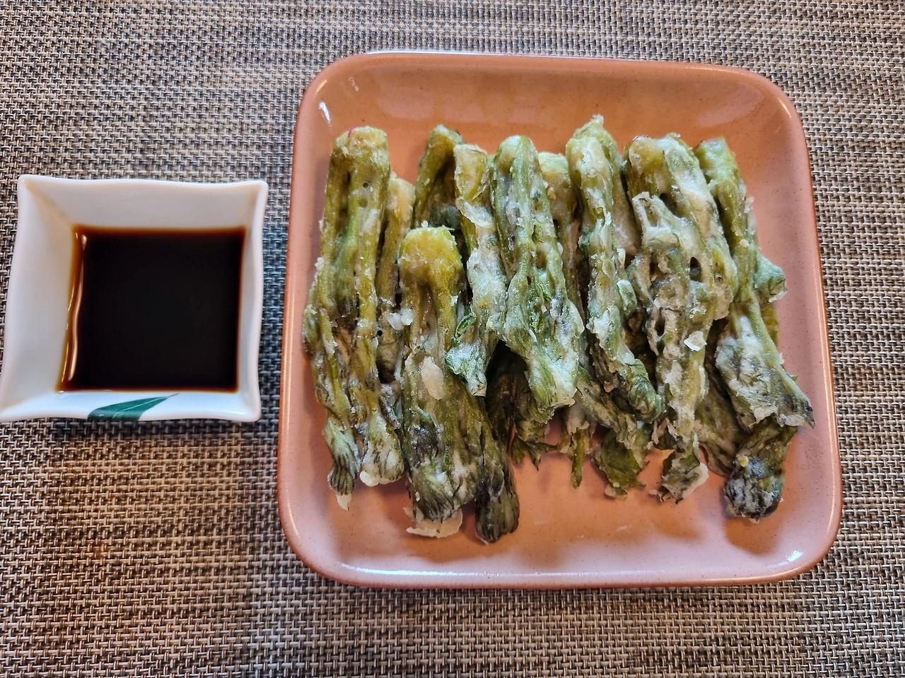 -두릅을 튀김가루 반컵과 물 반컵을 넣은 반죽에 넣는다.(취향에 따라 계란물을 입혀서 해도 좋아)