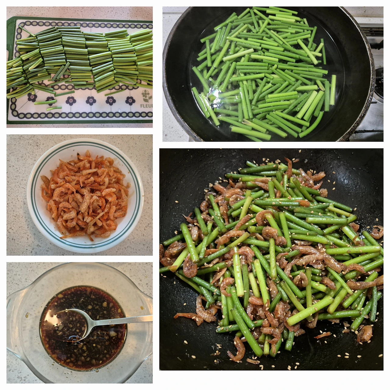-마늘종과 새우를 식용유를 넣고 좀 볶다가 양념장을 부은 뒤 중불로 양념이 배도록 조린다.