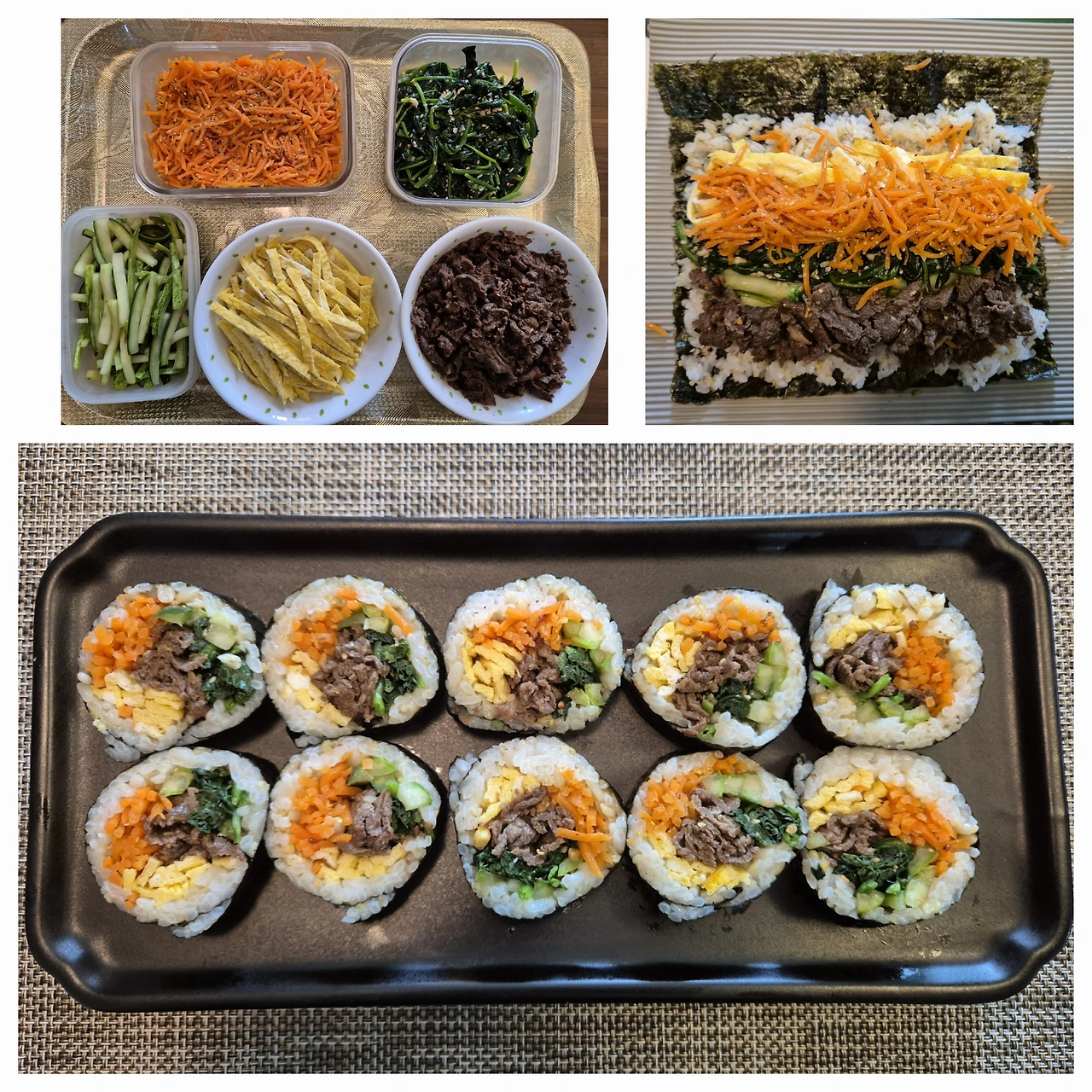 -위의 재료와 당근 라페를 듬뿍 올리고 김밥을 싼다.