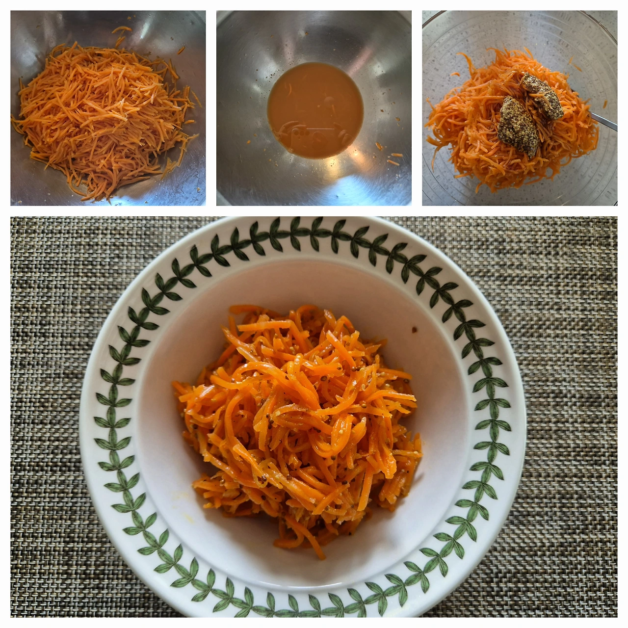 또 당근 속의 비타민 A는 지용성이라 기름과 함께 먹는 게 흡수가 잘 된다고 하는데 올리브유를 듬뿍 넣어서 만드니 과학적으로도 좋은 방법이라고 생각한다. 홀그레인 머스터드의 감칠맛과 상큼한 레몬즙까지 넣으면 나물처럼 밥반찬으로도 좋고, 고기와 곁들이면 느끼함을 잡아주고, 무엇보다도 샌드위치나 김밥을 했을 때 맛도 좋고 색감이 예뻐서 기분까지 좋아지는 요리였다.