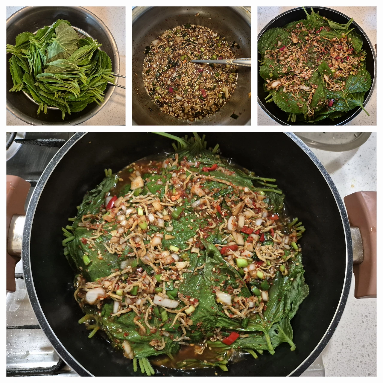 -냄비에 깻잎을 4~5장씩 잡고 빙 둘러놓으면서 위에 양념장을 켜켜이 얹는다.