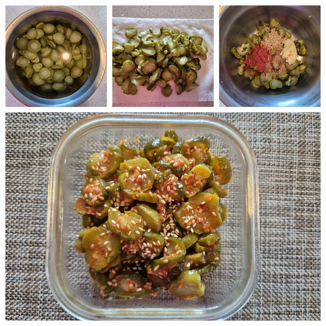 -오이지 3개를 슬라이스 해서 찬물에 30분쯤 담가 놓고 짠기를 뺀다.(먹어보고 짜면 더 둔다.)