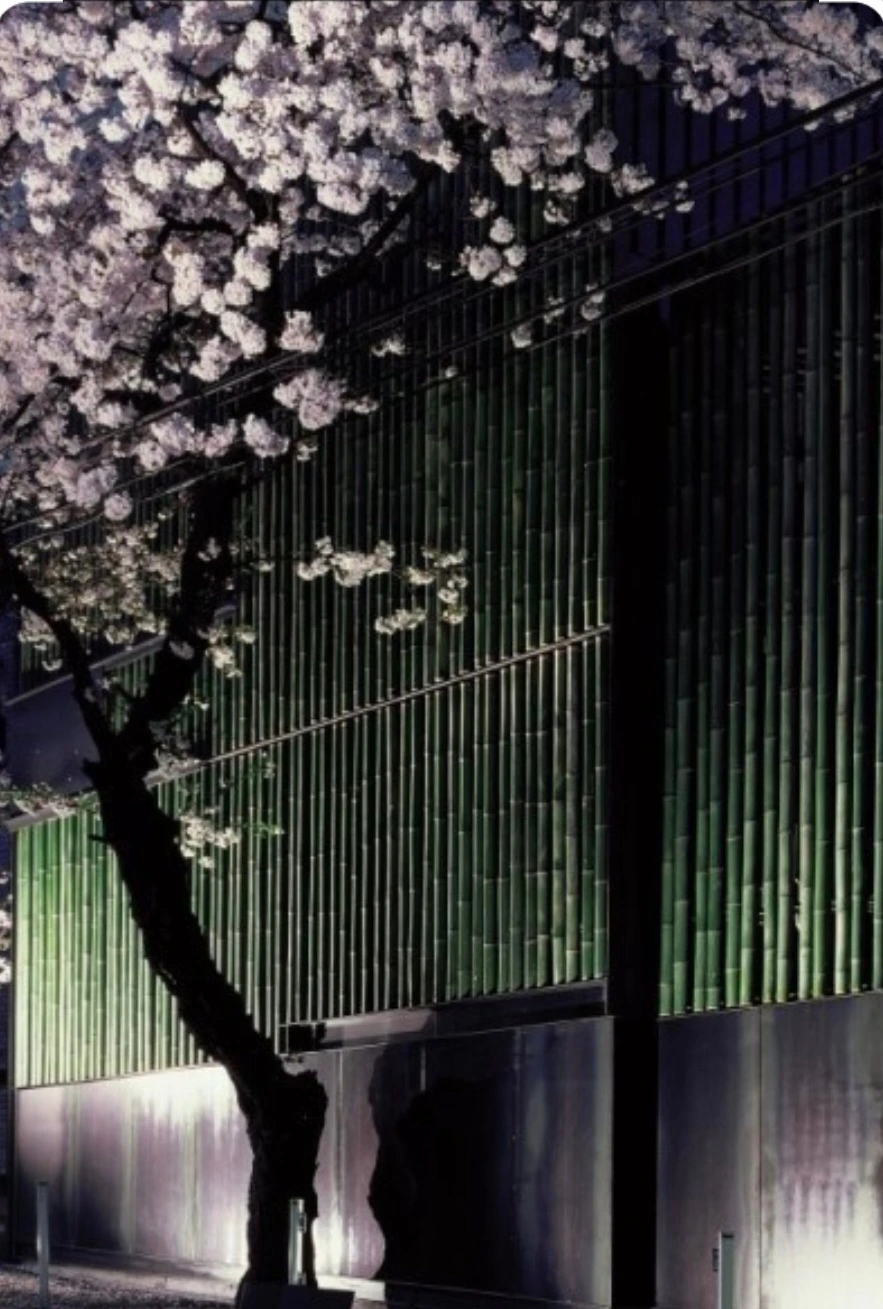 그의 여러 작품 중 일본 도쿄에 있는 ‘먹의 공간’이 특히 나의 관심을 끌었다. 건축 부지 앞의 두 그루의 오래된 벚나무를 자를 수 없어서 애초의 설계를 변경하여 건물의 파사드를 대나무로 바꾸고 벚나무를 살린 그의 건축은 거의 예술 작품처럼 보인다. 교토에서 공수했다는 대나무는 초기에는 초록색을 띄지만 세월이 흐르면서 점차 갈색으로, 나중에는 거의 검은색으로 변화한다. 자신도 건축가인 그의 딸이 시간에 취약한 대나무를 자재로 쓴 이유에 대해 질문하자, 아버지는 건축은 시간에 따라 다른 맛을 주는 작품이라고 하며 모든 건축이 결국은 폐허가 될 운명임을 명심해야 한다고 말한다. 그러면서 그는 시간이 가면서 대나무가 색도 변하고 비와 바람에 의해 세로로 갈라지면서 나중에는 대나무가 발처럼 가느다랗게 쪼개질 때를 기대한다. 봄밤에 벚꽃이 만발했을 때 찍은 이 건축의 사진은 비현실적일 정도로 아름답다. 하얀 벚꽃과 배경의 대나무들이 대조를 이룬다.
