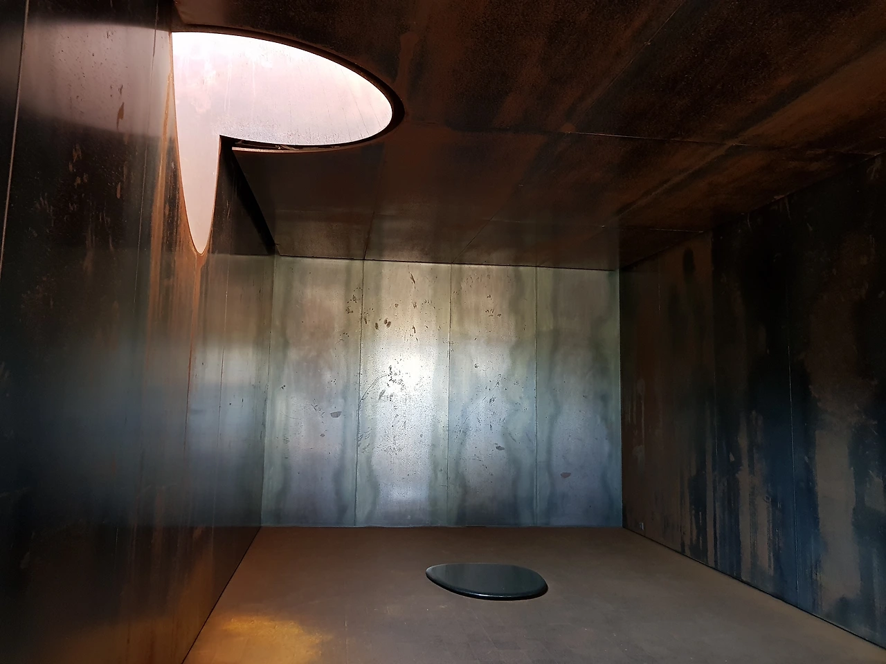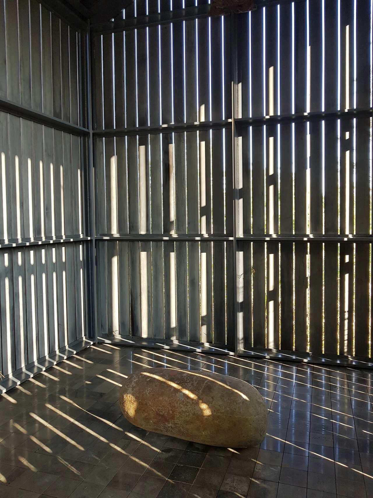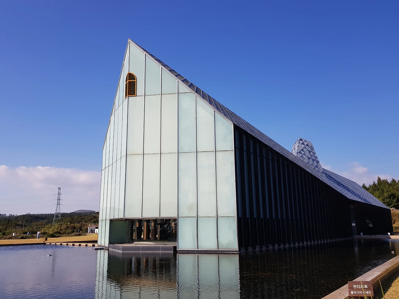 마지막으로 제주에 지천인 돌을 주제로 한 ‘석 미술관’이 있다. 돌이 주제라고 하지만 집의 재료는 금속이다. 이것도 역시 시간을 보여준다. 처음에는 반짝이는 금속의 외벽이었다가 비와 바람을 맞으며 산화해서 붉은색으로 변했다. 변화를보면서 사람들은 더 긴 시간이 지났을 때 이 건물이 어떤 폐허가 될지를 상상하게 된다. 지붕에는 원통형 창이 있고 그것을 통해 들어온 빛은 하트 모양을 이루고 하루종일 방 안에서 여행한다. 벽의 아랫부분 가로로 길쭉한 창밖으로 역시 가로로 긴 바위가 놓여있다. 그것을 관조하노라면 오래된 돌과 인간의 짧은 생이 대조되며 겸손해진다. 그러나 인간도 건축도 바위도 결국은 소멸한다. 남은 건 돌아다니는 빛뿐이다.