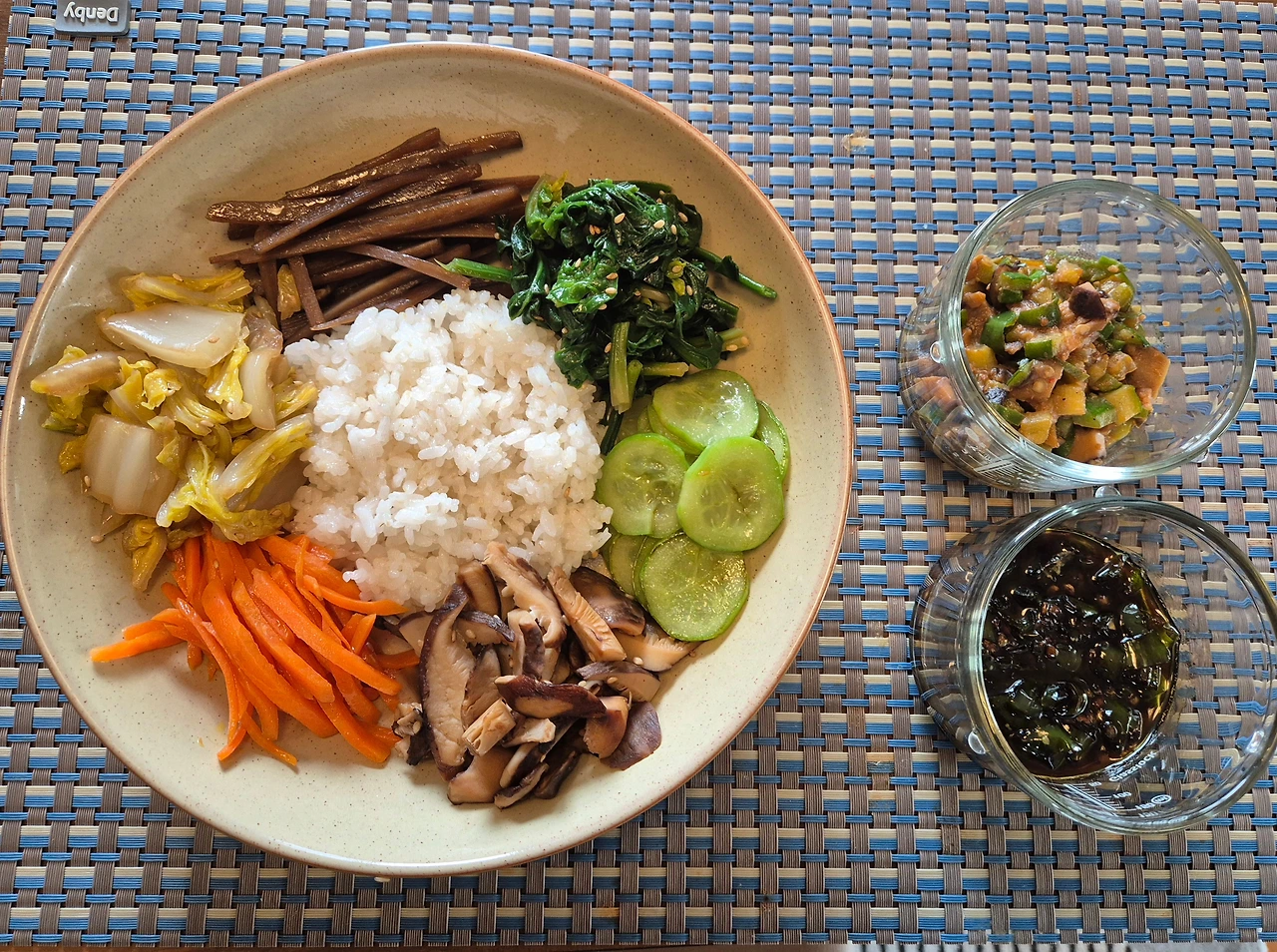결과는 아주 훌륭했다. 당근과 우엉은 서로 씹는 식감과 향이 달랐고 배추 나물은 연한 시금치나물과는 다르게 아작아작했다. 표고는 고기처럼 쫄깃했고 오이는 꼬들했다. 비빔장에 들은 청양고추는 매콤한 청량감을 주었다. 다양한 재료에서 느껴지는 식감과, 재료를 해치지 않고 조화롭게 섞어주는 소스까지 아주 맛있었다.