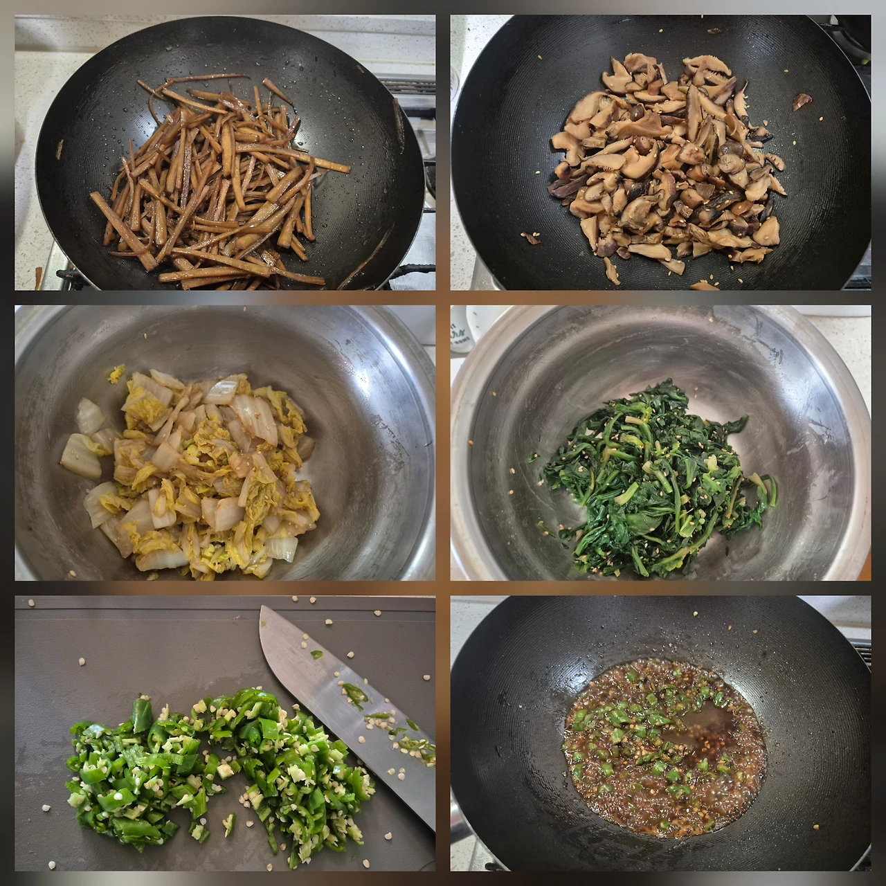 방송에서 본 대로 뿌리채소인 우엉과 당근은 채 썰어서 볶았고 시금치와 배추는 데쳐서 무쳤다. 오이는 살짝 절여서 물기를 짜서 볶고 표고버섯도 채 썰어서 볶았다.