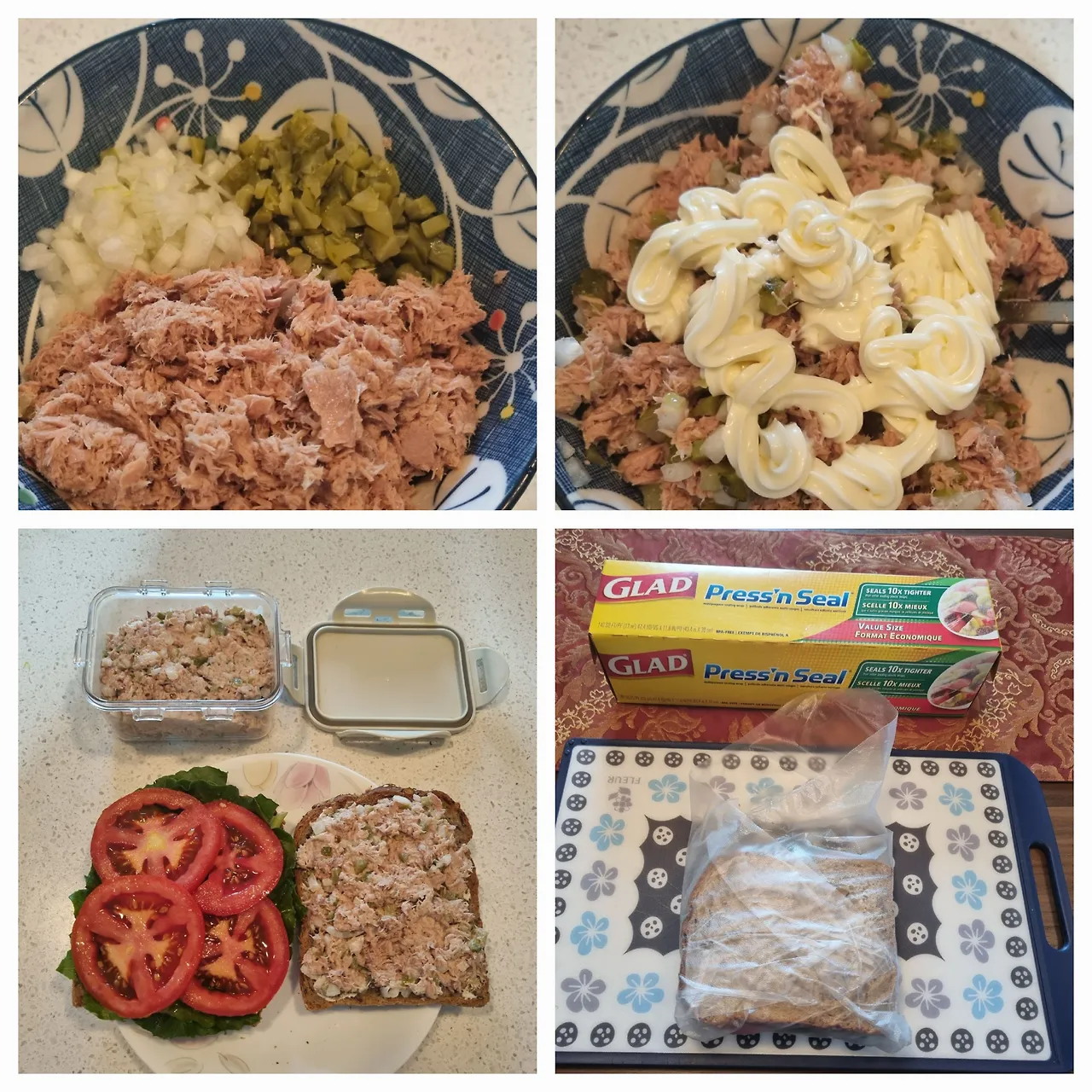 -150g 정도의 참치 통조림 2개를 체에 밭쳐 숟가락으로 꾹꾹 눌러가며 액체를 빼라.(이과정을 대충 하게 되면 질척거리는 샌드위치를 먹게 될 거야)