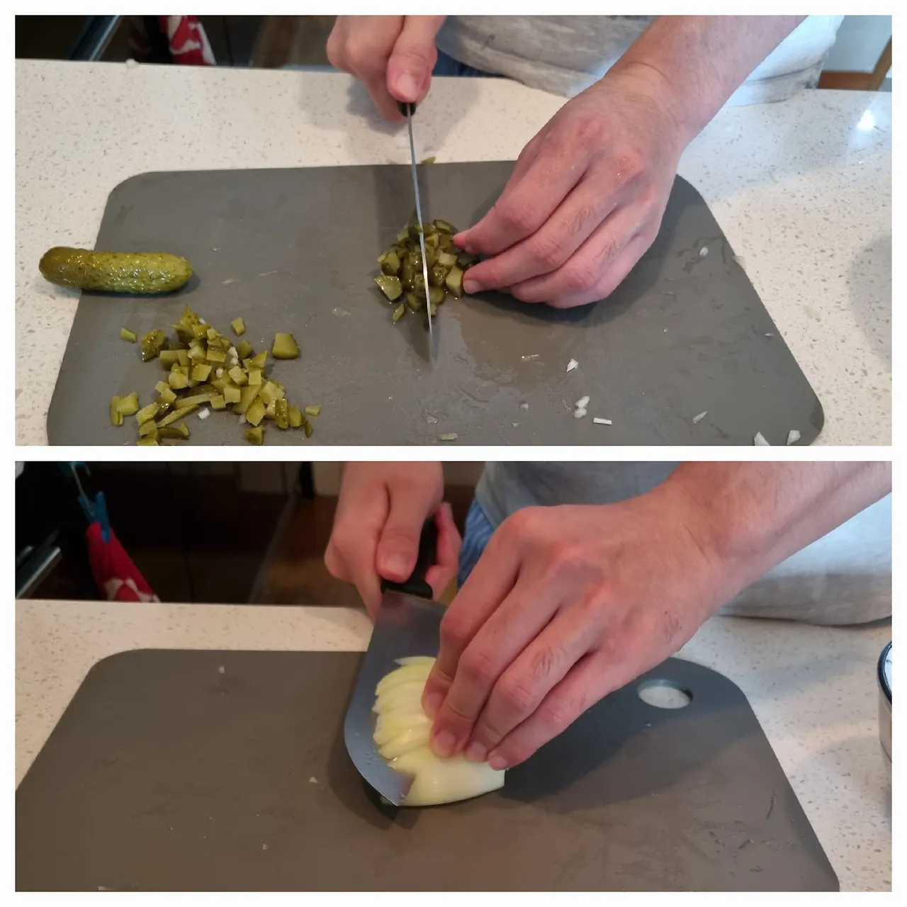 -오이 피클 두세 개를 다진 후 손으로 물기를 꼭 짠다.(만일 피자집에서 준 피클이 있다면 두 팩 정도 하면 된다.)