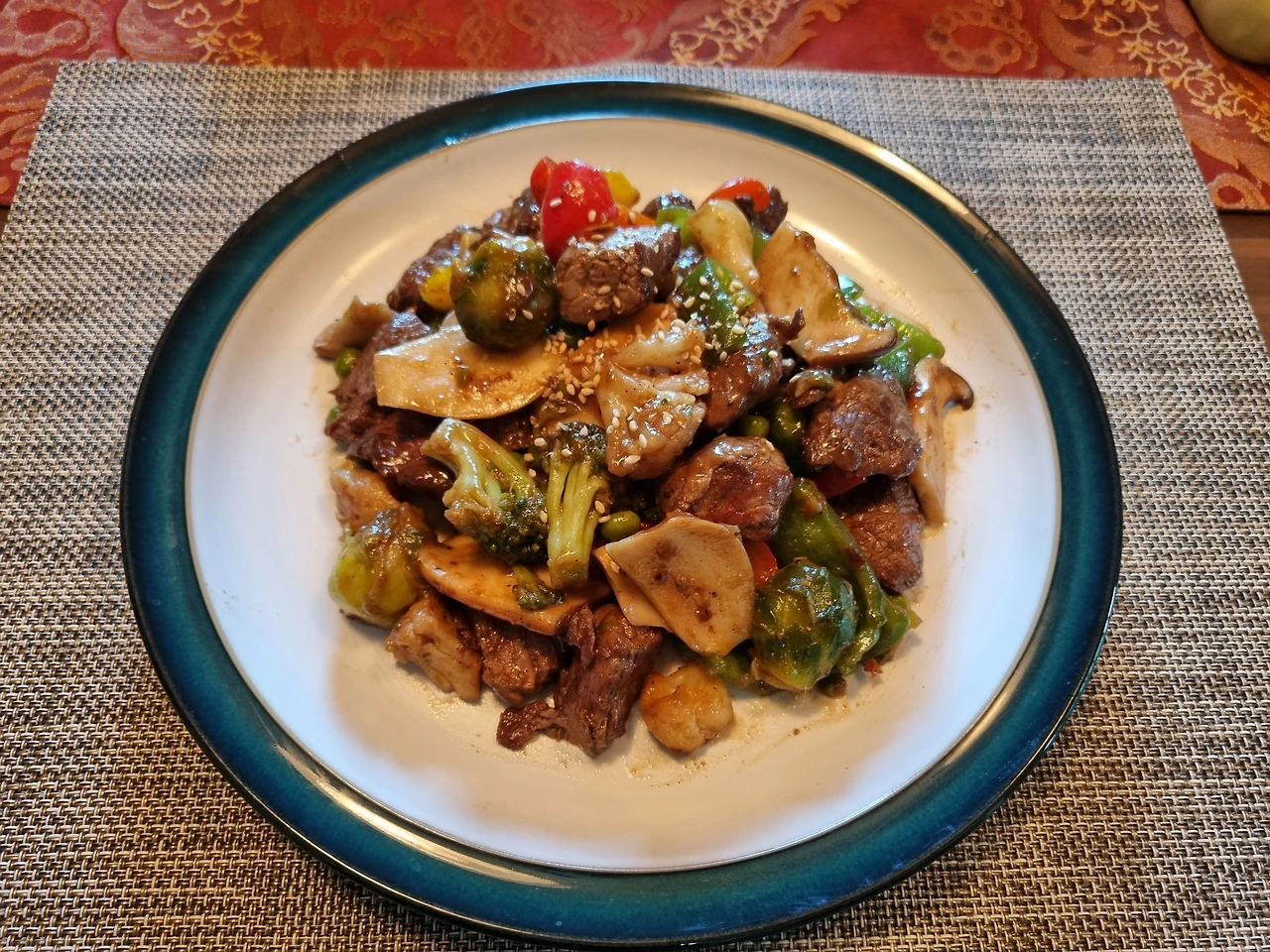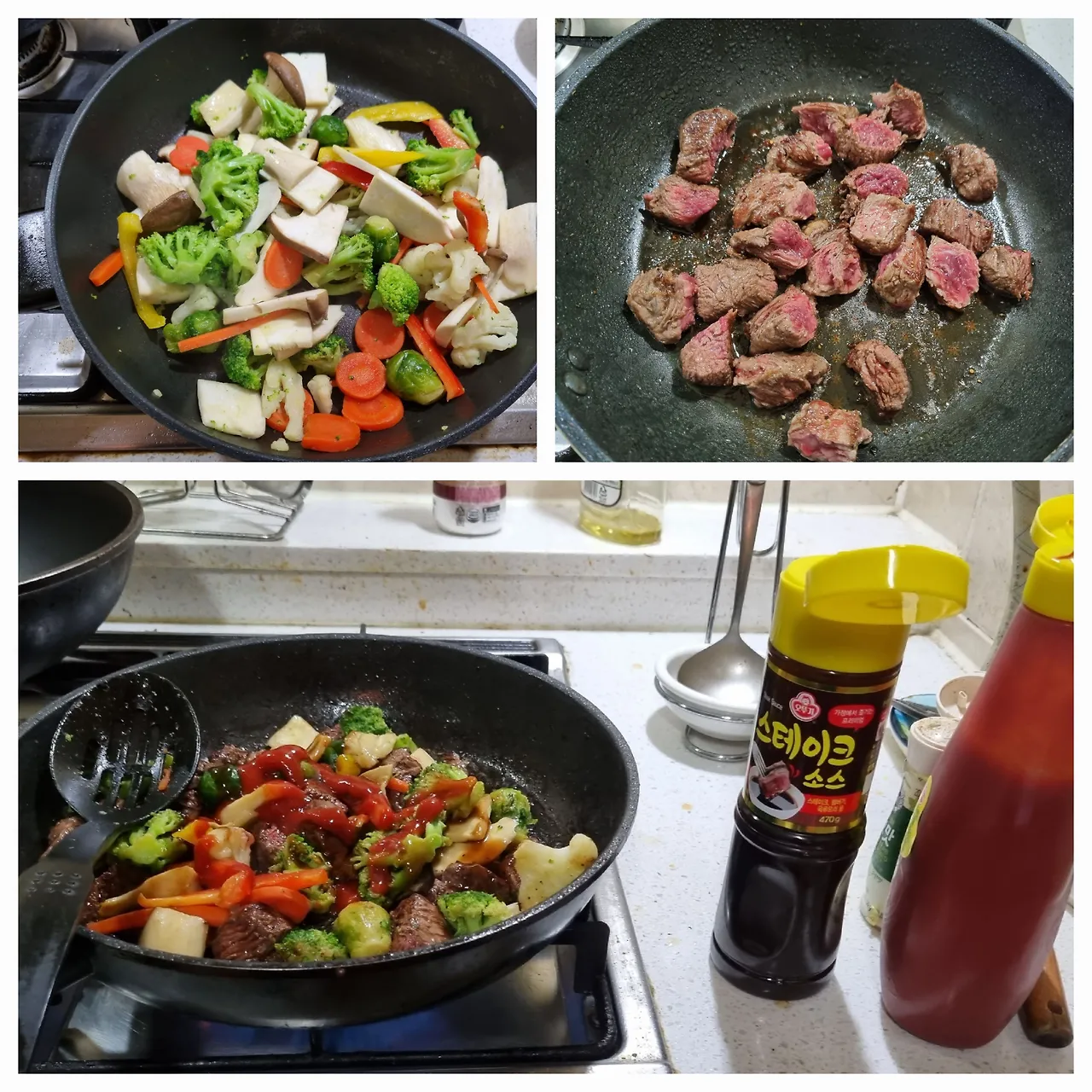 -아까 볶아놓은 채소를 고기가 있는 프라이팬에 다시 넣고 스테이크 소스, 케첩, 올리고당을 적당히 넣고 고기가 익을 때까지 볶아라.(소스는 너희가 차차 개발해봐. 매콤한 거 원하면 핫소스나 스리라차 소스 섞어도 되고, 감칠맛을 원하면 굴소스를 넣어도 된단다.)