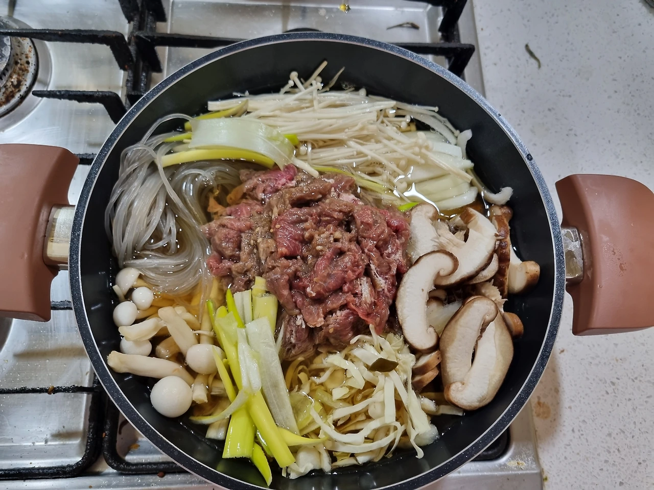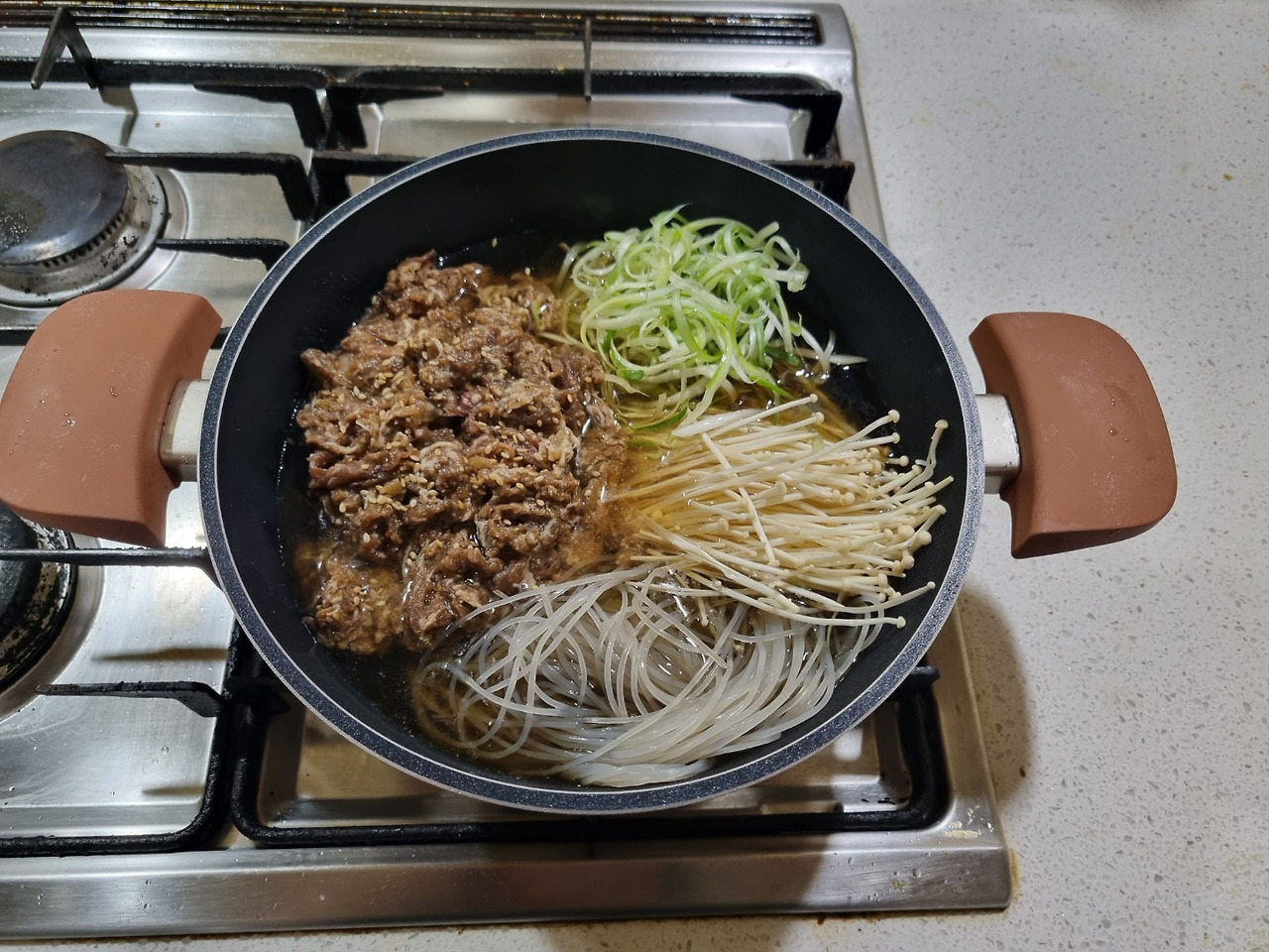 -넓은 전골냄비에 불고기와 파채와 팽이버섯, 불린 당면을 넣고, 멸치 다시마 육수를 적당히 넣고 불고기를 풀어가며 익혀서 먹어라.