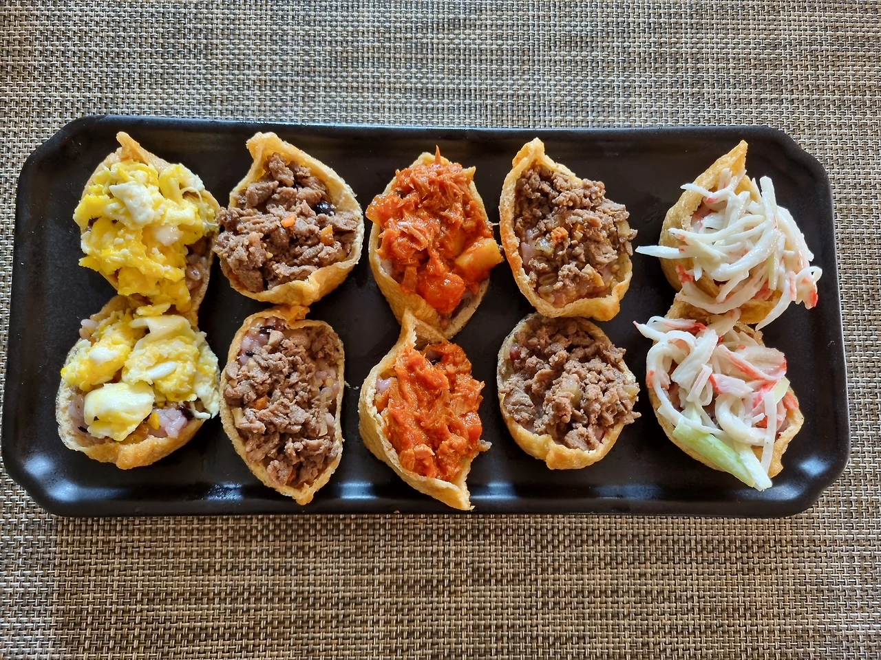 예전에 엄마가 쓰던 방법은 불고기 다진 거나 볶음밥 재료를 밥에 섞어서 넣는 거였는데 그렇게 해도 물론 맛있지. 그런데 요즘 백화점 지하 코너나 시중에서 여러 가지 토핑을 올린 유부초밥을 파는데 반응이 좋더라. 우리도 식당처럼 구하기 힘든 토핑 재료는 못 쓰겠지만 단백질을 보충할 수 있는 간단한 재료를 토핑으로 올리는 유부초밥을 한번 만들어보자.