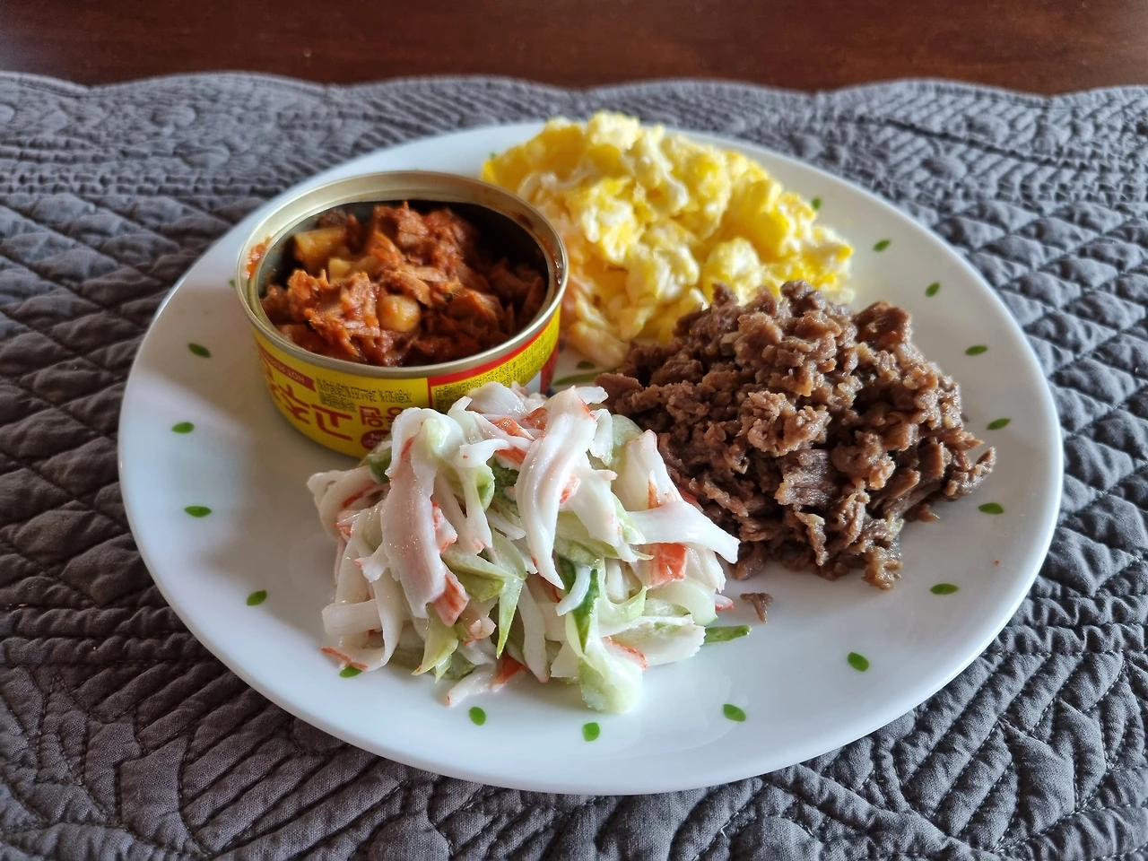 집에 늘 있는 계란과 참치캔과 크래미 맛살, 불고기 먹다가 남은 것으로 만들었는데, 훈제 연어 다져서 양파채랑 케이퍼를 가니시로 올려서 먹어도 아주 고급스러울 거고, 훈제 닭가슴살 꺼내서 데리아끼 소스에 조려서 올려도 훌륭할 거다. 시켜 먹다 남은 치킨 찢어서 볶아서 올려도 좋고.