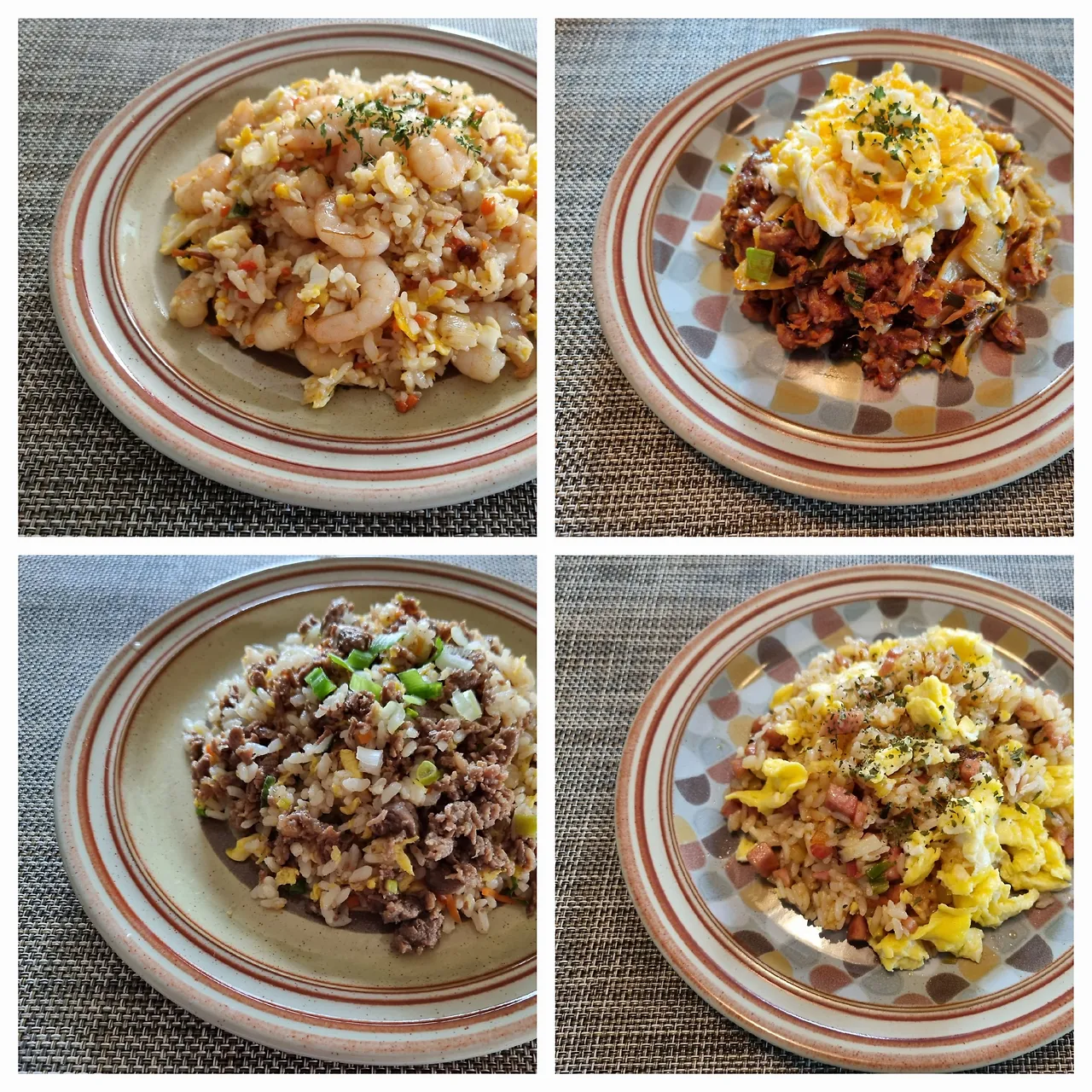 오른쪽위부터 시계방향으로 김치참치, 스팸감자, 불고기, 새우 볶음밥