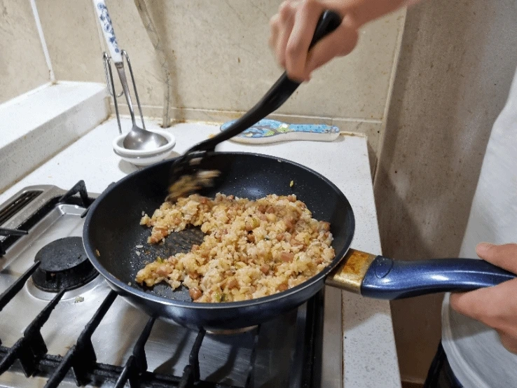 -일단 불을 끄고, 재료에 고슬고슬한 한 김 식힌 밥을 넣고 참기름과 굴소스와 스리라차 소스를 넣고 밥이 뭉치지 않게 펼치며 섞어.