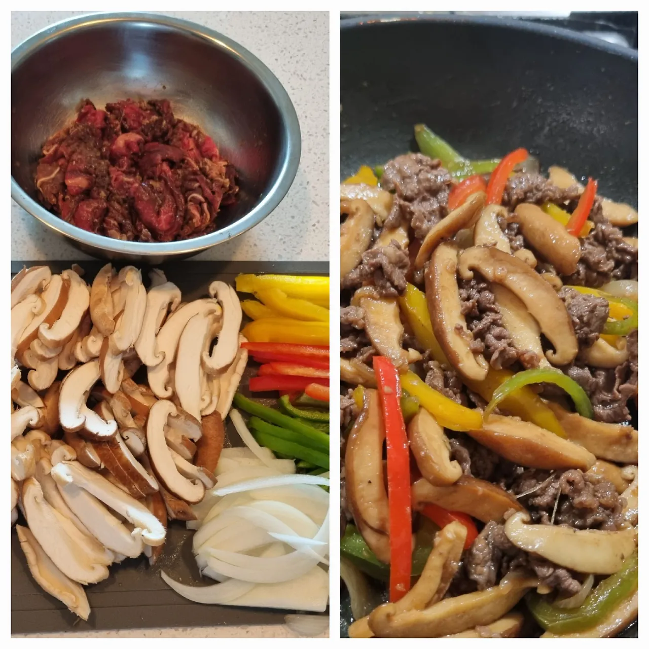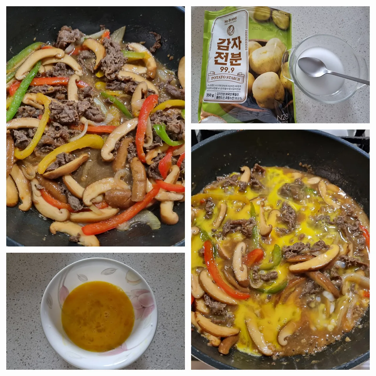 -다 익으면 다른 접시에 덜어놓고, 그 팬에 양념한 고기를 넣고 중불로 부드럽게 달라붙지않게 잘 펼쳐가며 볶다가 익으면 다시 볶은 채소를 섞은 뒤 조금 더 볶는다.