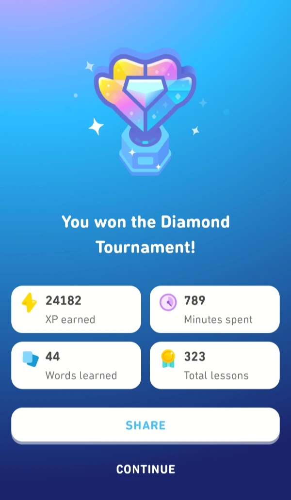 그냥 틈틈이 해왔을 뿐인데 어느덧 듀오링고 다이아몬드 리그를 넘어서 토너먼트 첫 우승까지 오게 되었다.