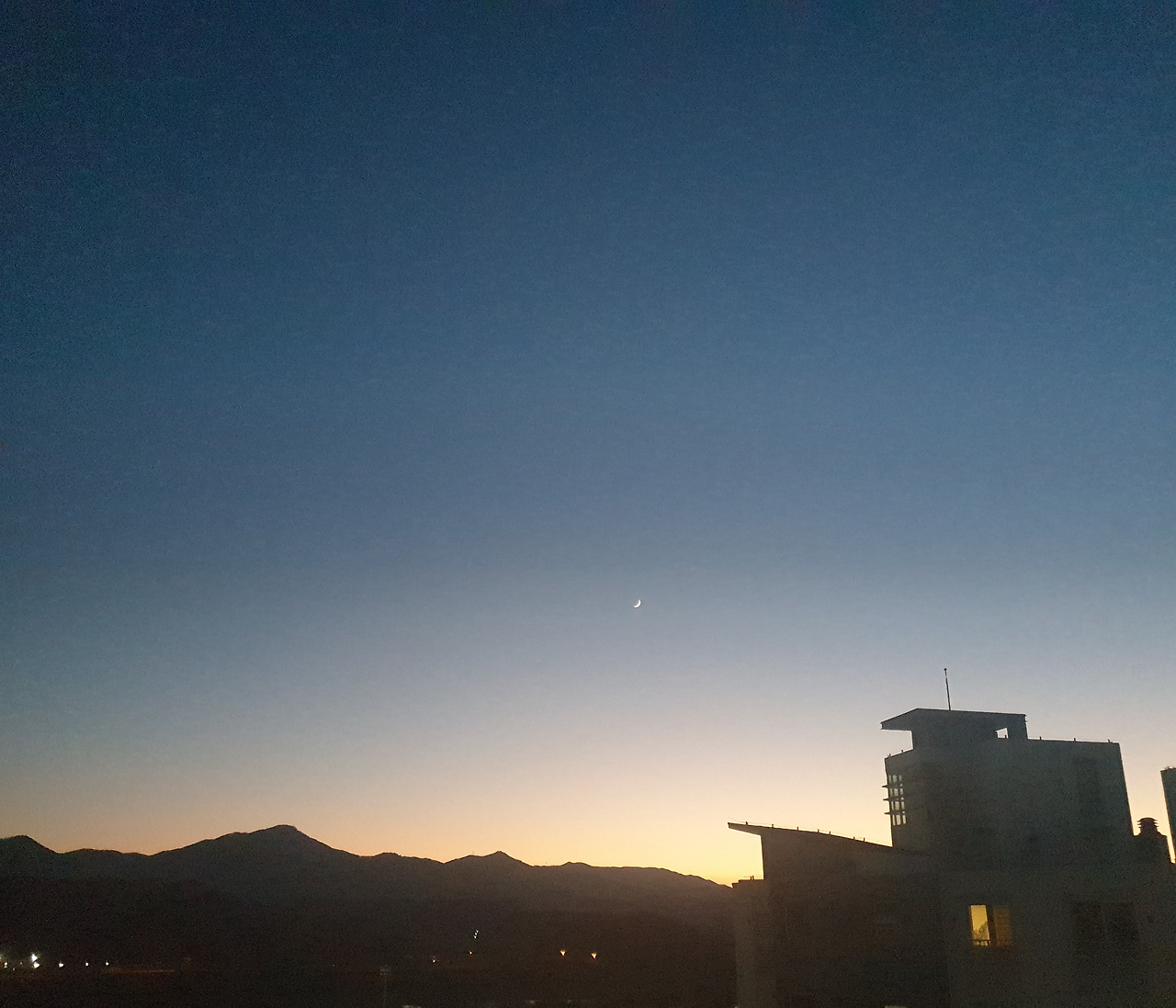 위 사진은 저녁 5시 59분, 아래는 5시 41분에 찍은 사진이다. 18분 동안 초사흘 달이 선명해지면서 해는 완전히 져버렸다.