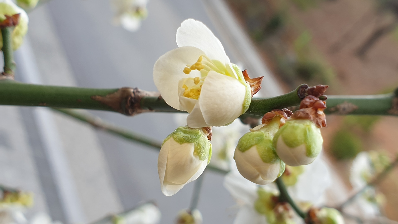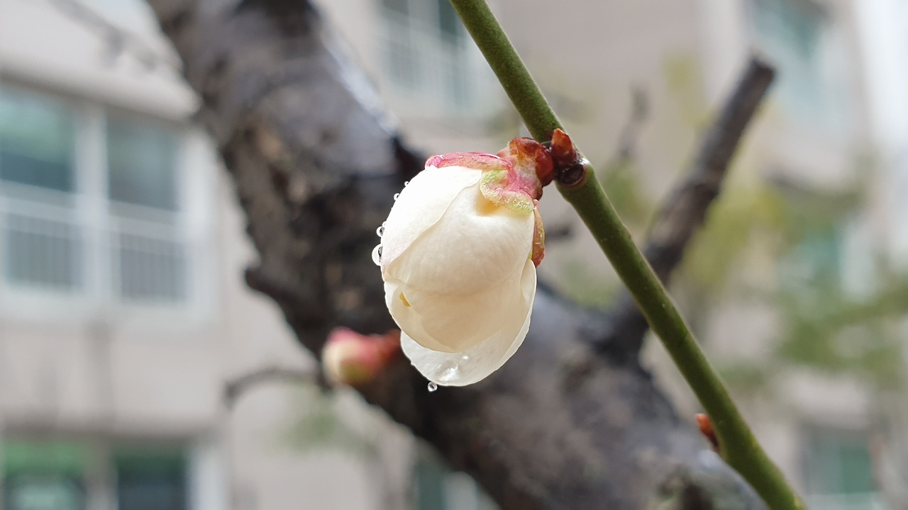 백매 봉오리가 입을 앙다문 채 진통을 겪고 있다. 오동통한 봉오리를 보호하여 감싸고 있던 꽃받침은 애가 쓰인다. "이제 아기 머리가 보여요. 힘을 더 주세요!" 이어서 "조금만 더! 더!" 연속해서 간호사가 분만을 유도하며 내게 소리를 질렀다. 간호사는 배가 아플 때 힘을 주라고 했다. 통증이 밀려들 때 배에 힘을 주며 순간적으로 용을 썼다. 봉오리 다섯 장의 꽃받침도 "조금만 더 힘을 줘!"라면서 봉오리의 용기를 북돋우는 것 같다.