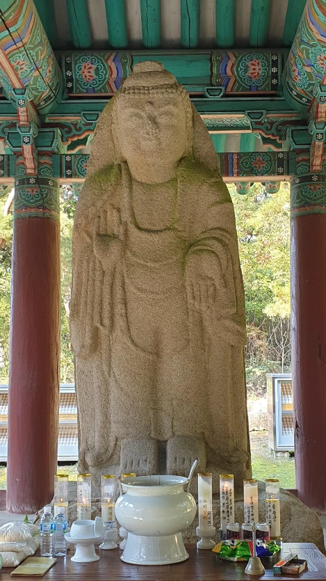 얼굴의 파손이 심해서 2007~8년 국립경주 문화재 연수에서 보수·정비하여 뺨과 코, 입 등 대부분 복원하였다고. 부처님의 몸이 당당하면서 안정감 있다. 가사는 왼쪽 어깨만 두르고 오른쪽 어깨를 드러내서 '편단 우견'하였다.>