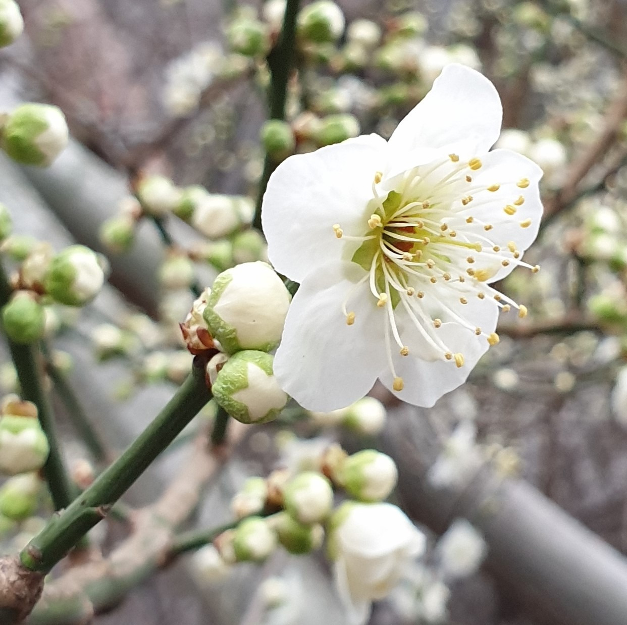 나는 멀리 있지만 가까이 있는 것처럼 향을 멀리, 널리 날려 보내는 사람이기를 이곳에서 발원했다. 아직 꽃이 덜 피어서 내가 한 보름 동안 녹악매의 사랑을 듬뿍 받을 것 같다. 다른 이에게도 나누어 줄 것이라는 염려는 할 필요가 없는 곳이다. 오직 나뿐이다. 녹악매는 여기 말고 또 있지만, 사람들이 매화에 관심이 없다는 사실이다. 가끔 나를 힐끔 쳐다볼 뿐 그냥 지나갔다. 나에게 이곳은 사진 찍기에 최적지이다. 어제 거세게 불던 바람이 심술을 얼마나 부렸는지 꽃과 봉오리가 바닥에 떨어져 있었다. 꽃과 팥 알 크기만 한 흰 봉오리 하나를 주워 재빠르게 집으로 향했다.