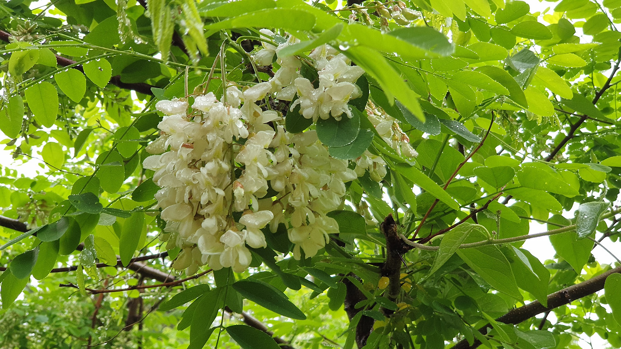 아래 사진: 선원 담장 밖으로 아카시아 꽃이 비를 맞고 있다.