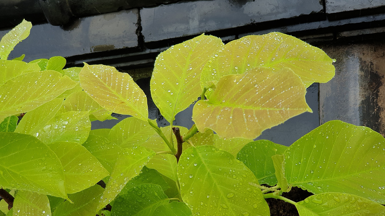 아래 사진: 선원에 봄이 머물고 있다. 연두빛 이파리에 맺힌 빗방울이 청량하다.