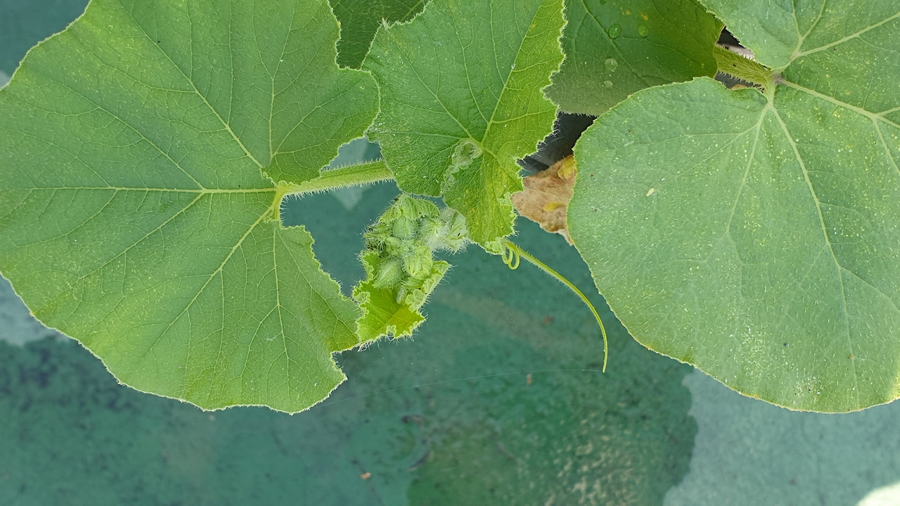 호박은 자웅동체(雌雄同體)하며 넝쿨을 뻗어 바닥에 뿌리를 내리며 기는 식물이다. 수꽃이 먼저 꽃을 피웠다. 옥상을 정탐하는 것인지 계속 수꽃이 피다가 호박이 달린 봉오리가 뒤를 이어 꽃을 피우는 것을 해마다 봤다. 어제 사진을 찍으면서 관찰하니 암꽃이 보였는데 이미 노란 빛을 띠고 있었다. 그리고 덩굴손이 뻗기 시작했다. 원인과 결과가 잎 줄기 마디마다 한 넝쿨에 뭉쳐 있었다. 덩굴손, 수꽃, 암꽃이 한 덩어리로 출발하여 제 갈길을 갔다. 덩굴손은 뻗으면서 지지할 곳을 더듬어 찾고, 암수꽃은 각각의 역할에 충실했다.