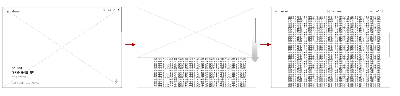 게시글은 브런치의 핵심 서비스이다. 전체 화면 기준으로 스크롤이 적용되며, 타이틀+이미지가 매쉬업 된 영역을 넘어 스크롤 다운하게 되면 화면 최상단에 기존 헤더에 해당 게시글을 작성한 작가 프로필 이미지와 작가 닉네임이 표시된 형태로 헤더가 노출된다. 서비스 정책 UI는 특이점이 없어 이 글에서는 언급하지 않겠다.