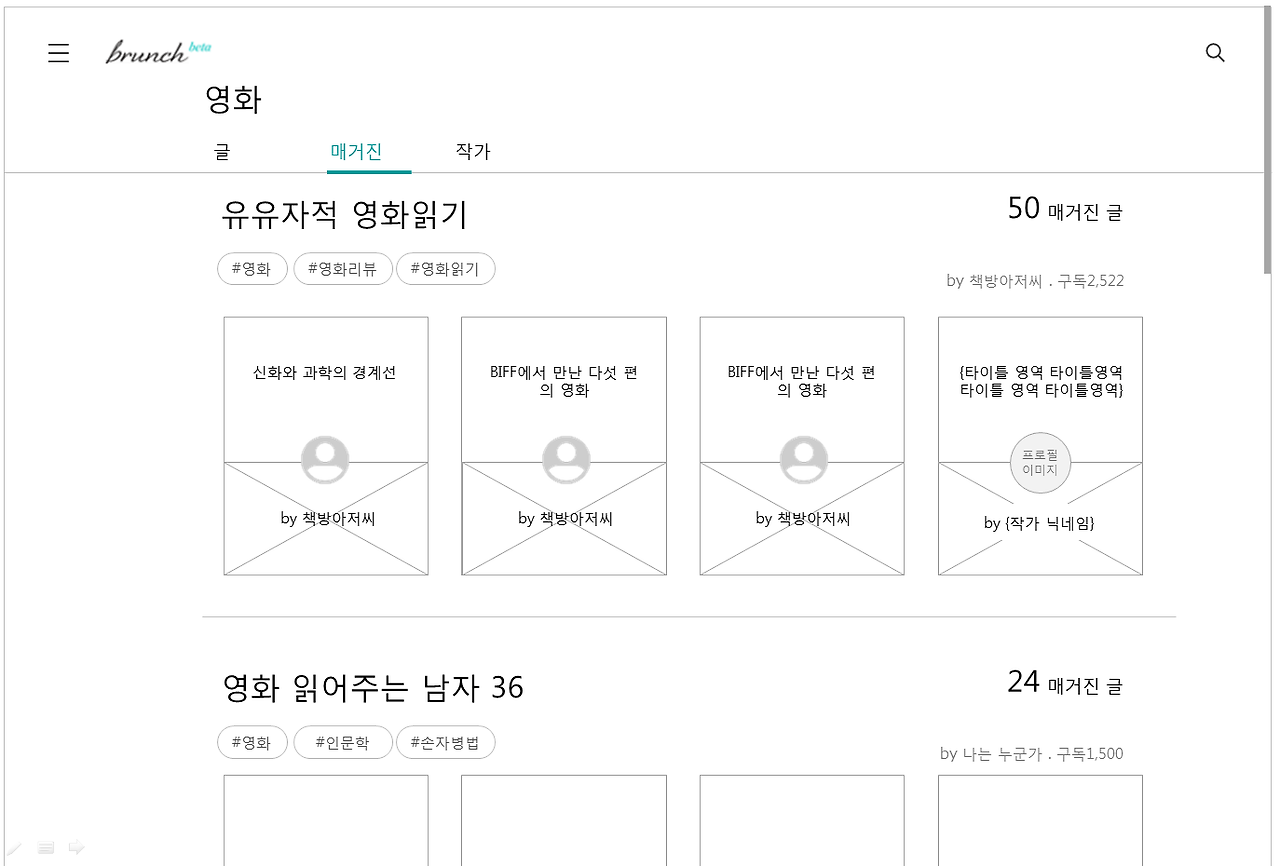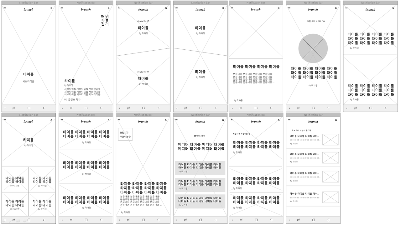 브런치의 화면은 크게 '전시/배치하는 화면', '게시글', '서비스 정책' 화면으로 구분된다.