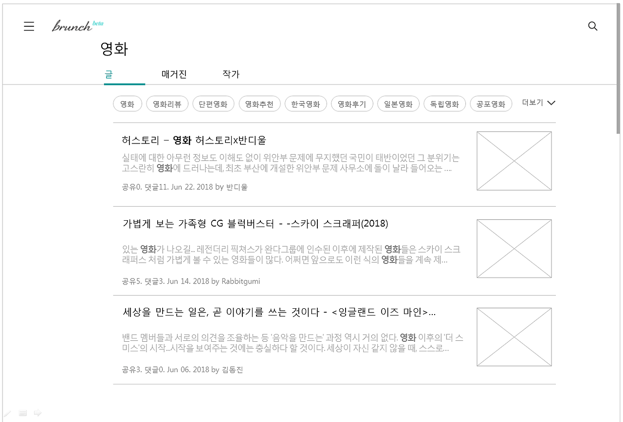 통합검색은 최근 업데이트 된 후 작가와 주제 단위 키워드 안내 기능이 강화되었지만 기본 구조는 글, 매거진, 작가, 키워드로 구성되어져 있다.