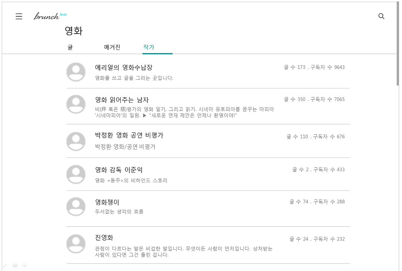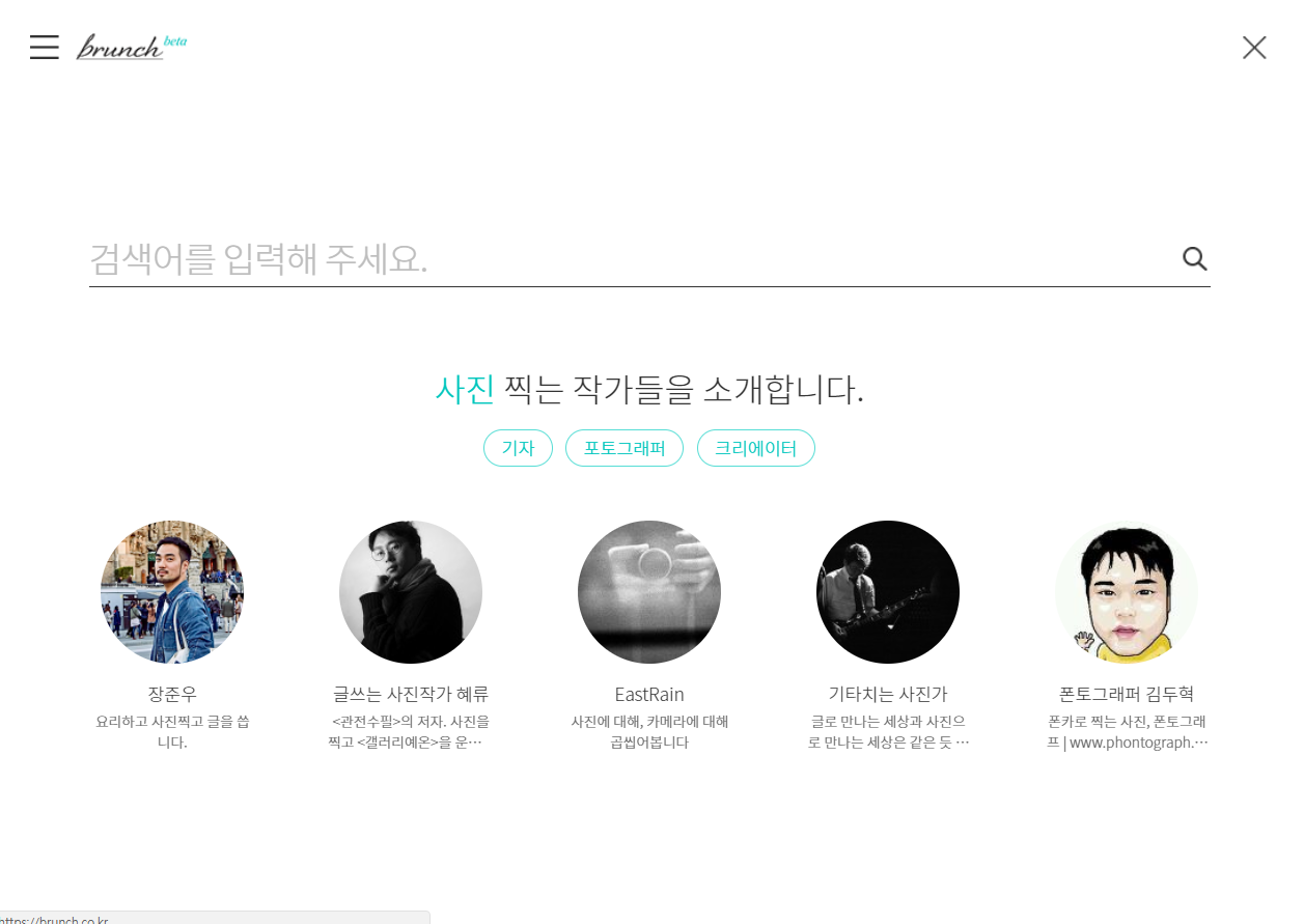 최근에 작가 검색 기능이 업데이트 되면서 통합검색 기능도 달라졌다. PC의 경우 이전에는 검색 버튼 클릭 시, 텍스트 필드 창이 생성되어 키워드를 입력하였지만 업데이트 이후 검색어 입력 화면으로 바디를 덮어버렸다. 키워드 창 하단에는 브런치 대표 작가들을 보여주고 있다. 실력있는 작가들을 모집/양성하고, 독자들이 개인취향에 맞는 작가를 팔로우하여 꾸준히 브런치를 이용하게 하려는 전략이 돋보인다.